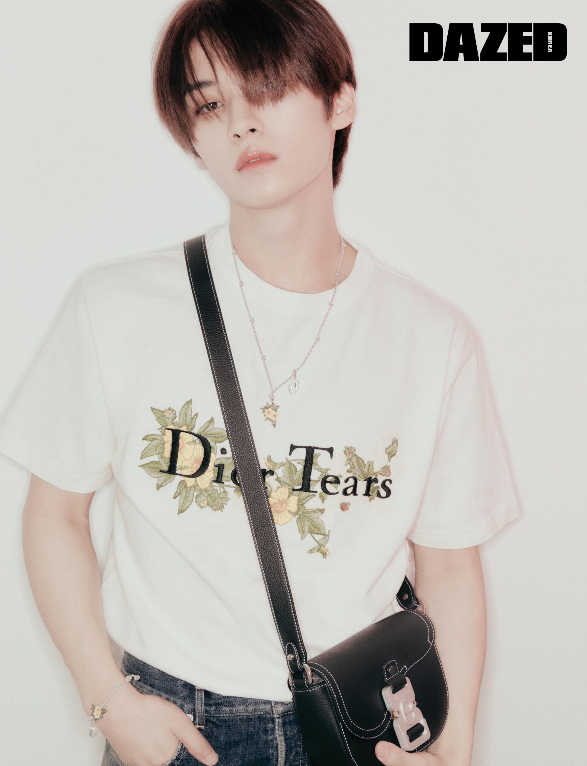DIOR TEARS 코튼 플라워 엠브로이더리 디테일의 화이트 코튼 저지 티셔츠와 DIOR TEARS 오블리크 자크론 블루 오버다이 코튼 데님 팬츠, 멀티컬러 코드 & 핸드페인팅 레진 소재의 DIOR TEARS 플라워 펜던트 프레시 워터 펄 네크리스, 핸드페인팅 레진 소재의 DIOR TEARS 플라워 & 프레시 워터 펄 디테일의 멀티컬러 코드 브레이슬릿, 블랙 그레인드 카프스킨 스트랩 새들 파우치 백은 모두 디올 맨(Dior Men).