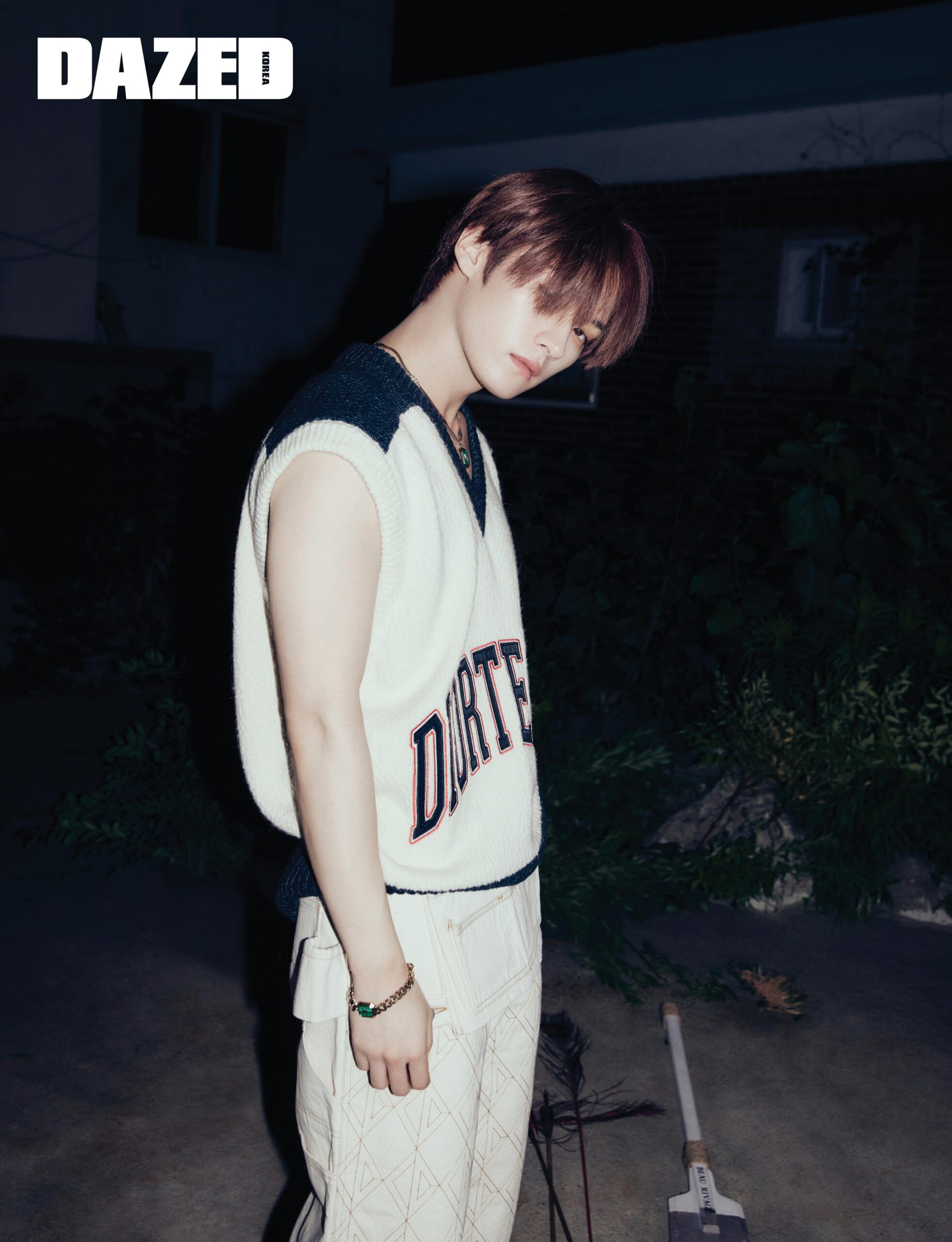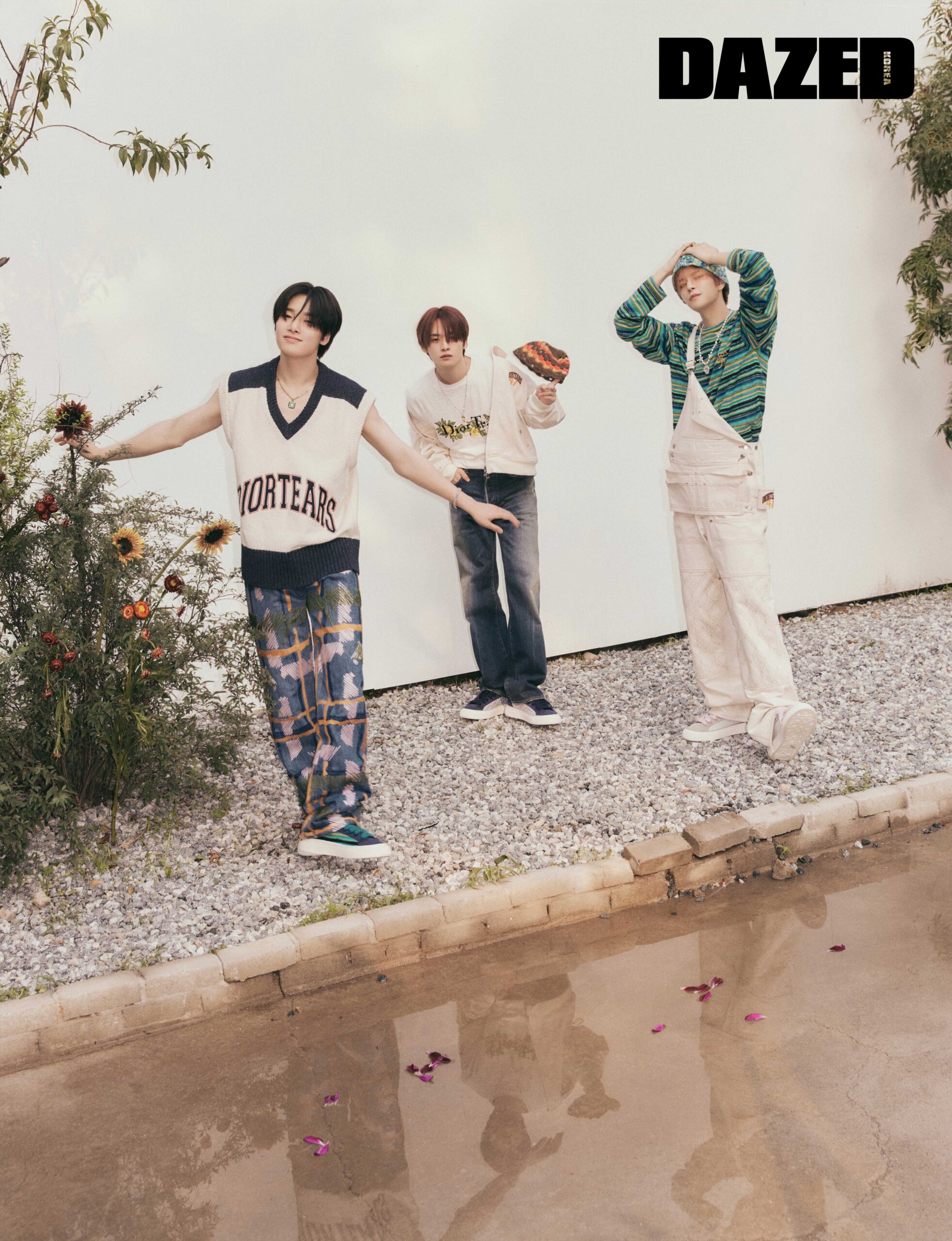 아이엔이 입은 DIOR TEARS 엠브로이더리 디테일의 화이트 & 블루 컬러 블록 코튼, 울 & 알파카 소재 슬리브리스 브이넥 톱과 올 오버 엠브로이더리 블루 코튼 데님 팬츠, 블루 스웨이드, 블루 모헤어 디올 오블리크 모티브가 새겨진 크림 리버 솔 B33 테니스 스니커즈, 골드 피니시 브라스 & 말라카이트 소재의 DIOR TEARS 펜던트 네크리스, 핸드페인팅 레진 소재의 DIOR TEARS 셸 디테일의 멀티컬러 코드 브레이슬릿은 모두 디올 맨(Dior Men). 리노가 입은 DIOR TEARS 엠브로이더리 오프화이트 코튼 데님 블루종과 DIOR TEARS 코튼 플라워 엠브로이더리 디테일의 화이트 코튼 저지 티셔츠, DIOR TEARS 오블리크 자크론 블루 오버다이 코튼 데님 팬츠, 블루 스웨이드, 디올 오블리크 자카드, 디올 오블리크 모티브가 새겨진 화이트 러버 솔 B33 테니스 스니커즈, 브라운·오렌지·레드 스트라이프 핸드 크로셰 버킷 해트, 멀티컬러 코드 & 핸드페인팅 레진 소재의 DIOR TEARS 플라워 펜던트 프레시 워터 펄 네크리스는 모두 디올 맨(Dior Men). 승민이 입은 블루 블렌드 코튼·모헤어·알파카 소재의 스트라이프 패턴 DIOR TEARS 엠브로이더리 크루넥 톱과 CD DIAMOND 엠브로이더리 디테일을 탈착할 수 있는 DIOR TEARS 에이프런 오프화이트 데님 점프슈트, 그레이 스웨이드, 디올 오블리크 자카드, 디올 오블리크 모티브가 새겨진 크림 러버 솔 B33 테니스 스니커즈, 블루 멀티컬러 핸드 크로셰 버킷 해트, 골드 피니시 브라스 & 말라카이트 소재의 DIOR TEARS 링, 실버 피니시 브라스 & 블랙 코드 소재의 DIOR TEARS 피스 사인 펜던트 프레시 워터 펄 네크리스는 모두 디올 맨(Dior Men).