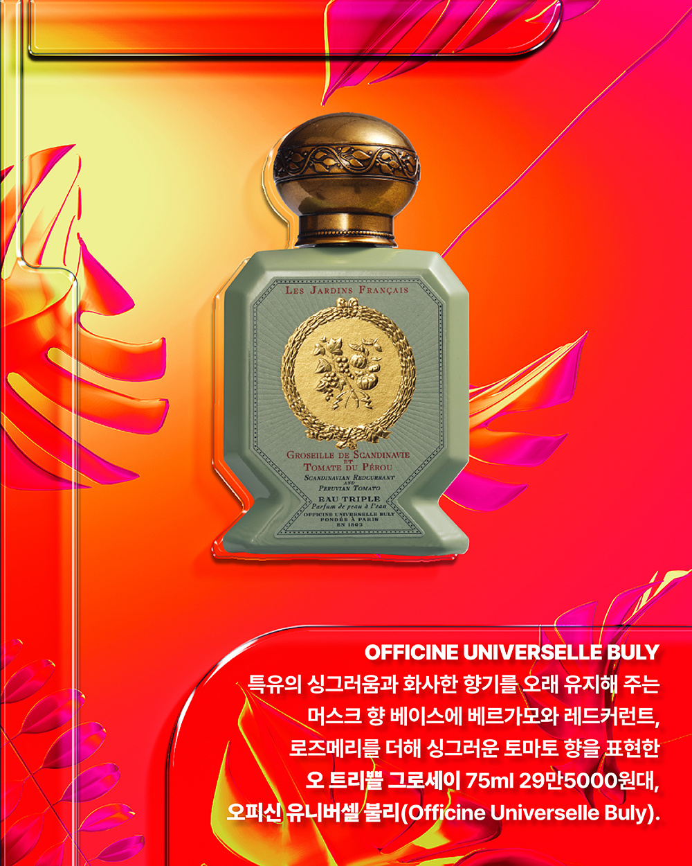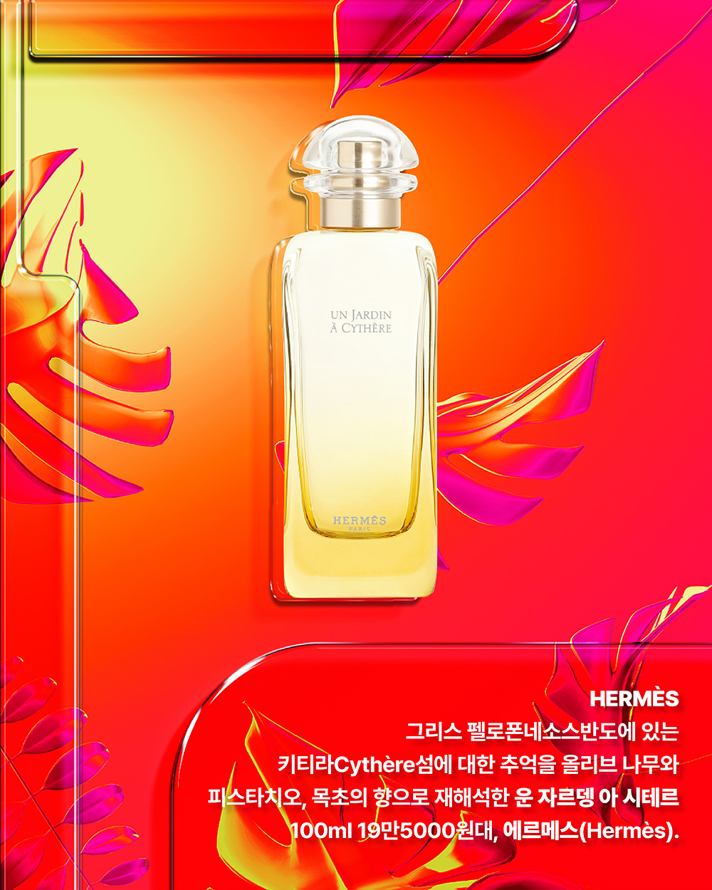 커지는 시장 규모만큼 더욱 다채로운 향이 등장하고 있지만, 올여름은 시트러스 향이 대세일 듯 하다. ‘여름철 시트러스’ 하면 다소 뻔한 것 같지만 자세히 살펴보면 그 상큼한 향에도 각각의 디테일이 엿보인다. 그중 가장 큰 특징은 많은 브랜드가 지중해 같은 이국적 장소를 각기 다른 기억과 감각으로 풀어 낸것으로, 향뿐 아니라 여름날 푸른 자연의 색감을 패키지에 녹여낸 섬세함이란. 사실 지중해 어느 나라도 가본 적 없지만 침대에 상쾌하고도 이국적인 향수를 가득 뿌려놓고 여유롭게 눈을 감고 있으면 그곳이 바로 휴양지가 아니겠는가. 이런 대리 경험을 향수 하나로 할 수 있다니 꽤 합리적이라는 생각까지 든다. 또 특정 지역에서만 수확 가능한 희귀 원료를 사용하거나 곡물과 채소의 향을 담은 독특한 향수가 출시되고 있으니 아직 천생연분 향수를 찾지 못했다면 곧만나게 될지도.