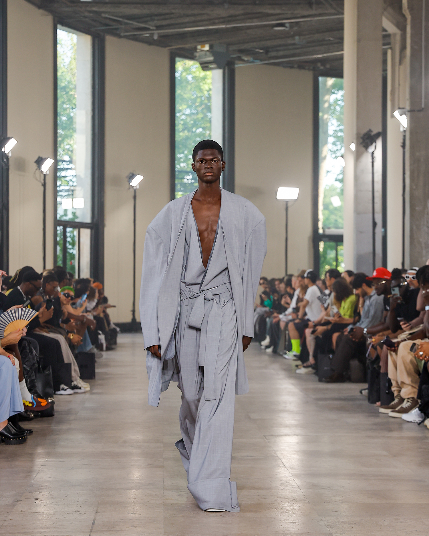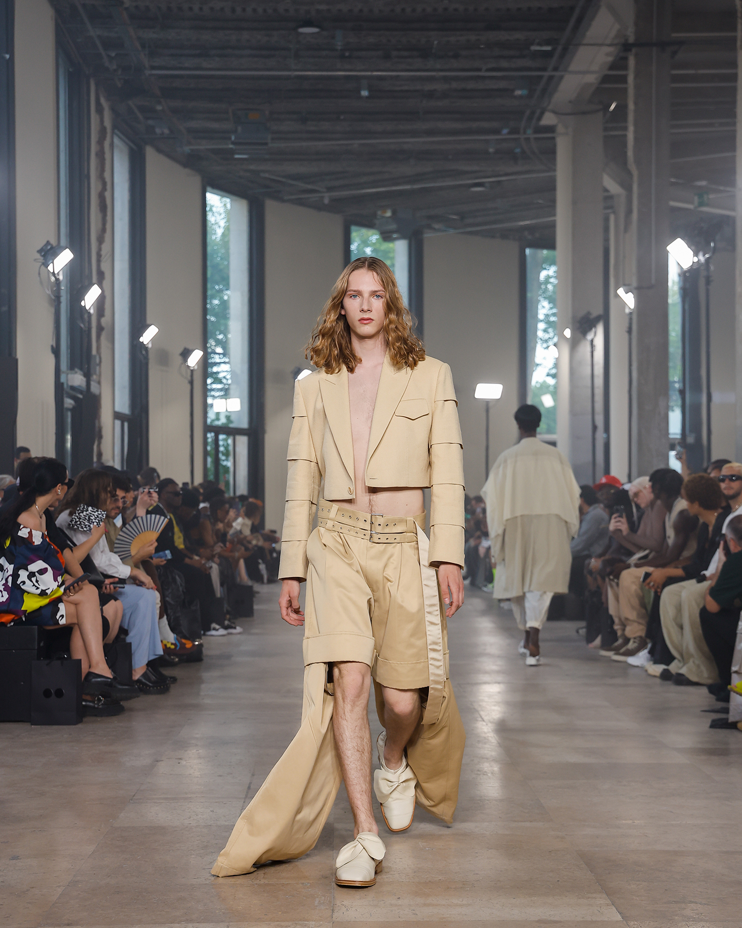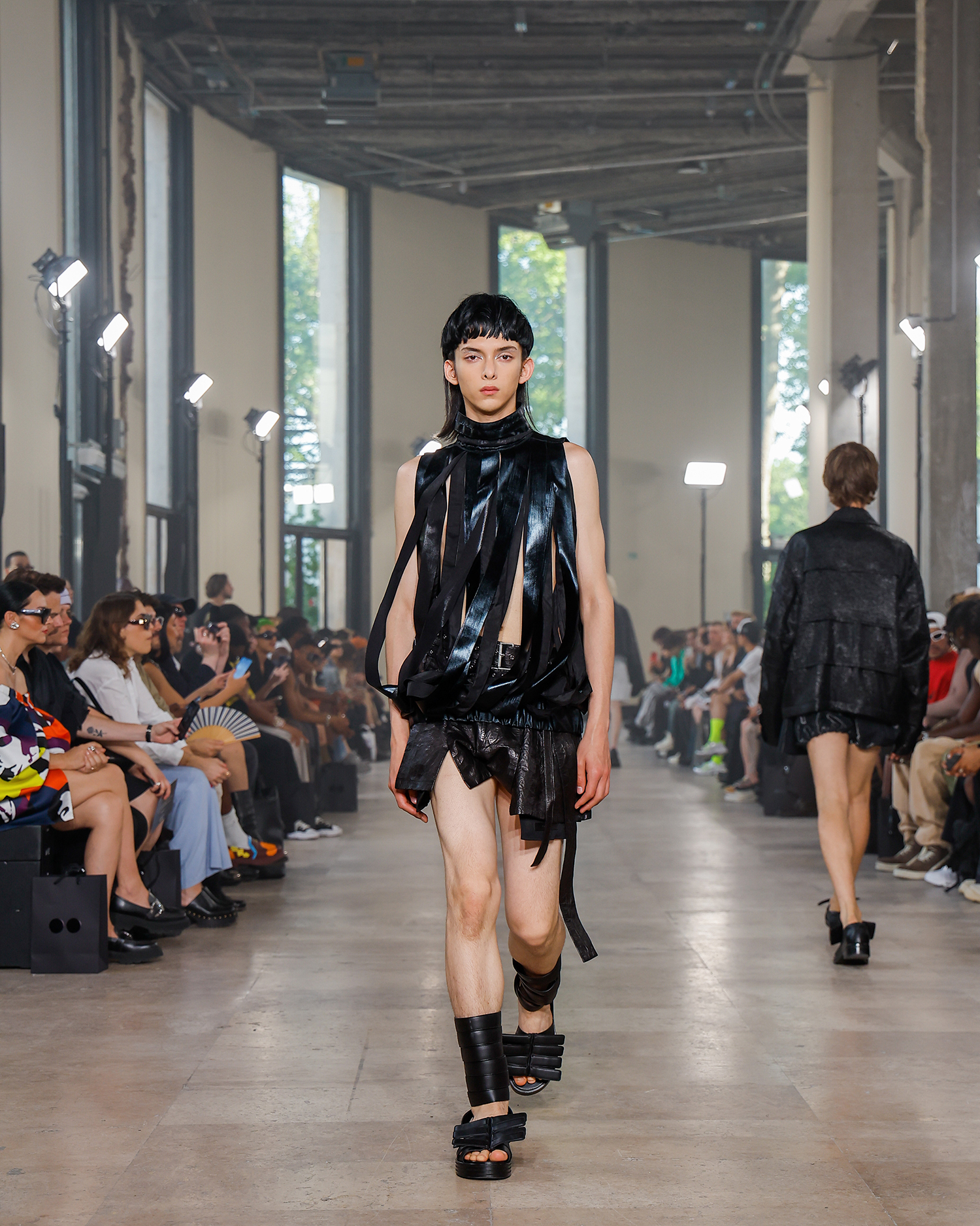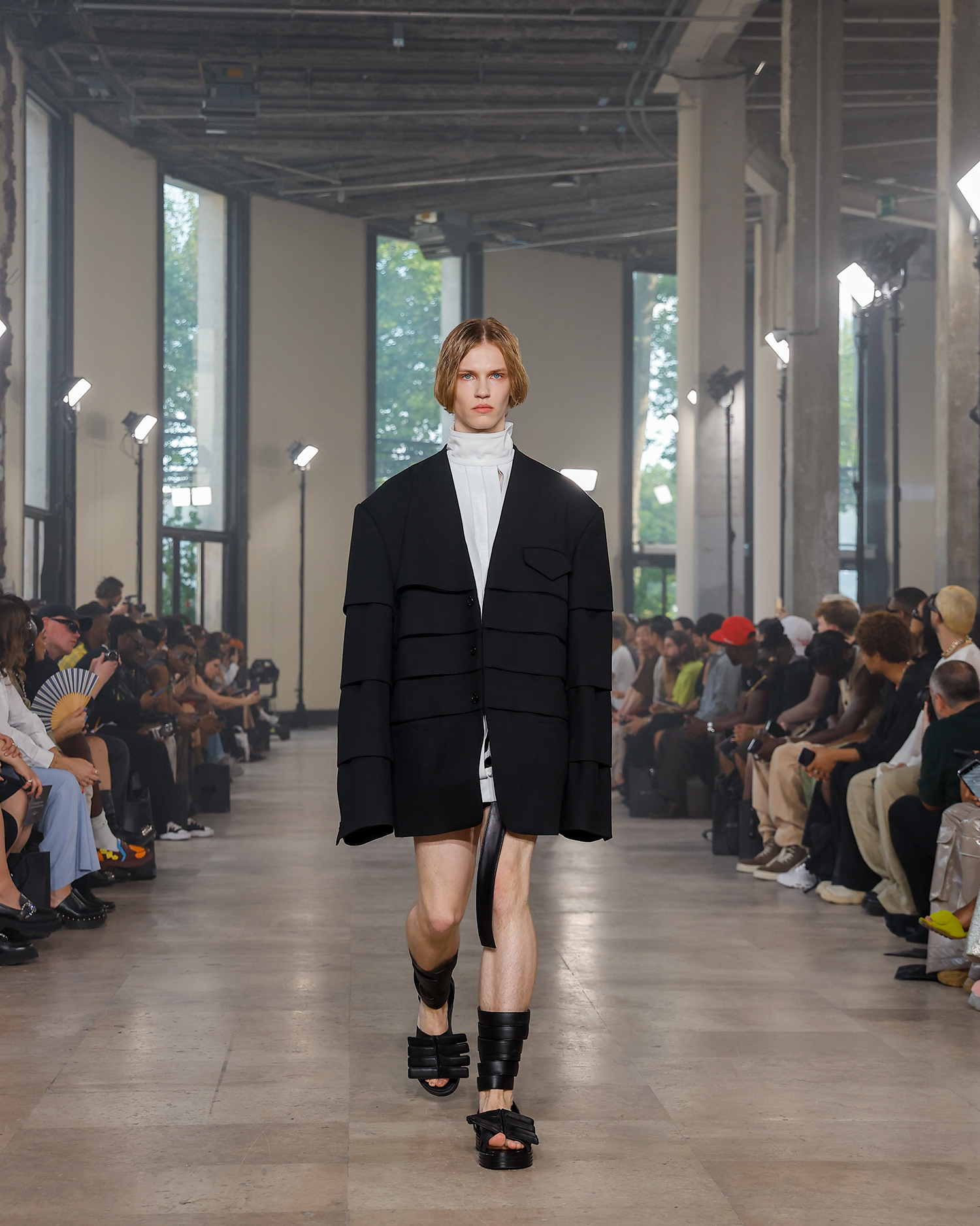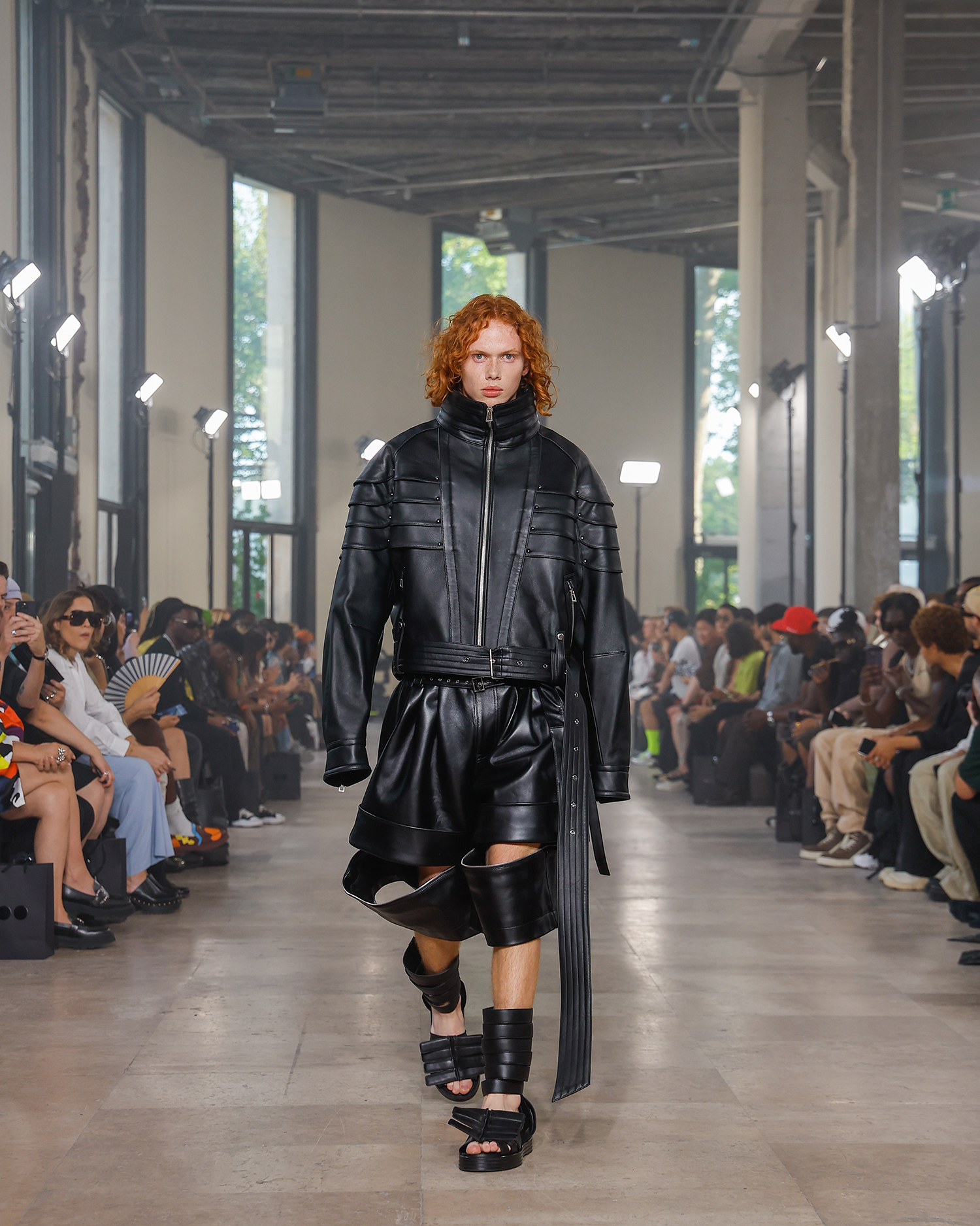 Pure Rebel은 ‘순수한 반역자’라는 뜻으로, 이를 컬렉션에서도 여실히 녹여냈다. 마치 갑옷을 모티브로 한듯한 디테일은 의상뿐만 아니라 신발에서도 확인할 수 있다. 컷아웃된 톱과 팬츠가 만들어내는 유니크한 실루엣, 집업 디테일 팬츠를 연출하는 방법, 리복과의 협업 제품까지. 밝은 희망에서 검은 물결로 이어지며 파리에 순수한 반역을 일으킨 SONGZIO의 2024년 S/S 컬렉션. 이로 미루어 보건대 ‘반역자’는 송재우 바로 본인이 아닐까.