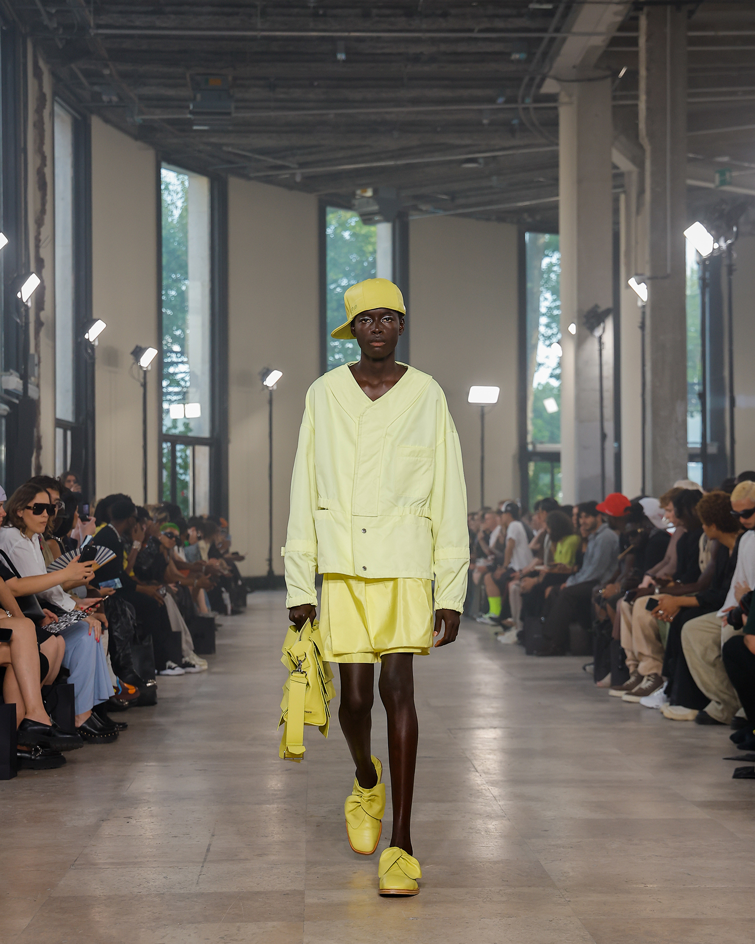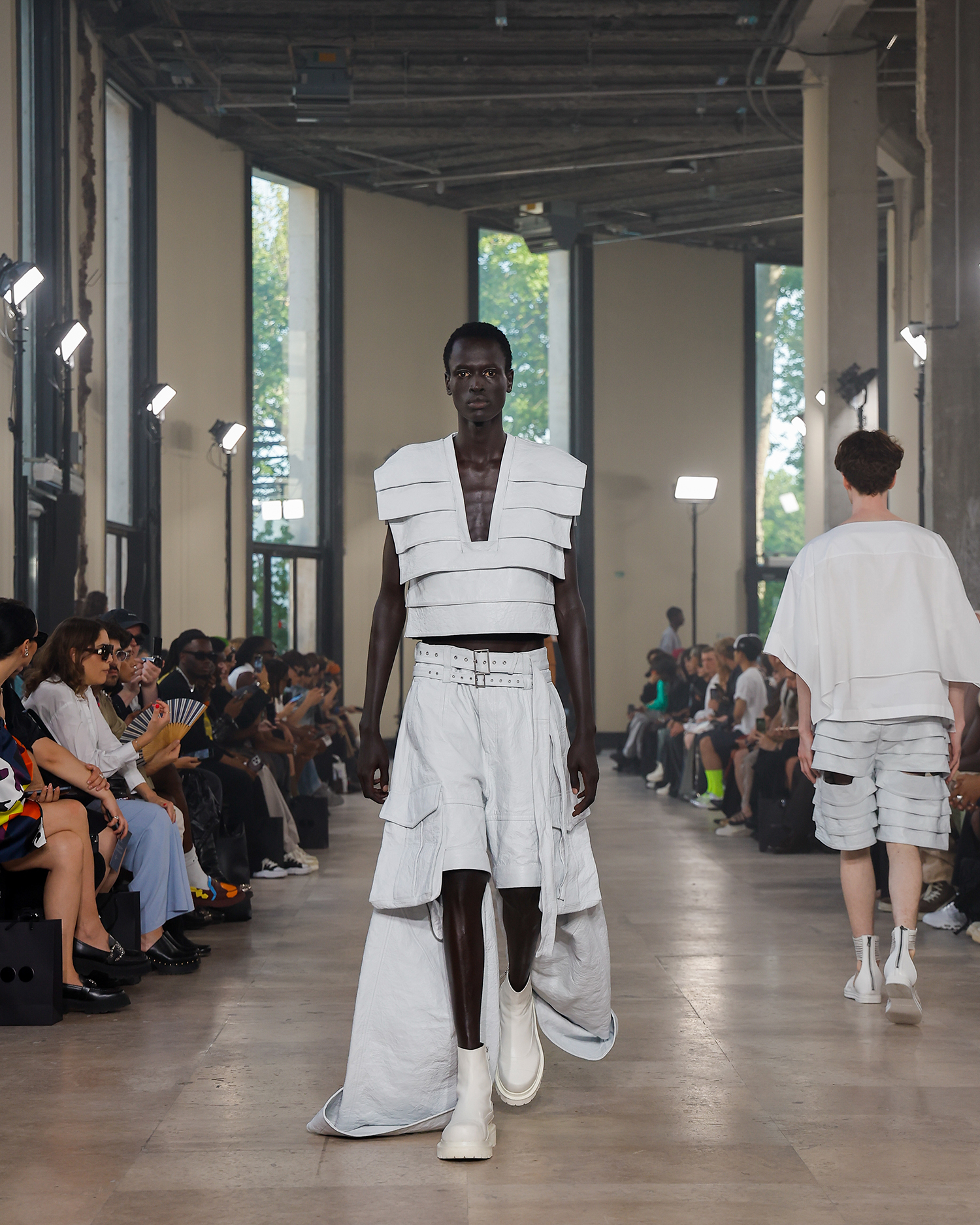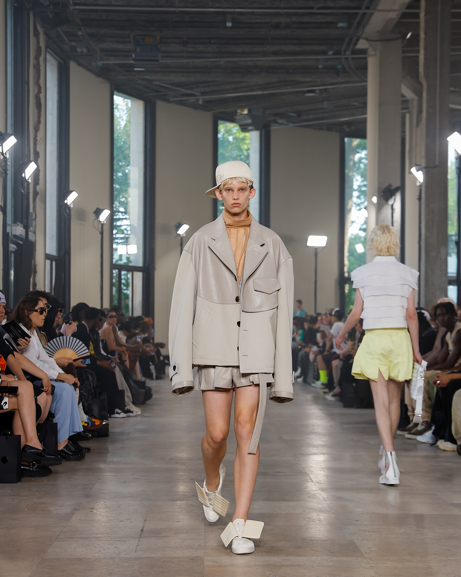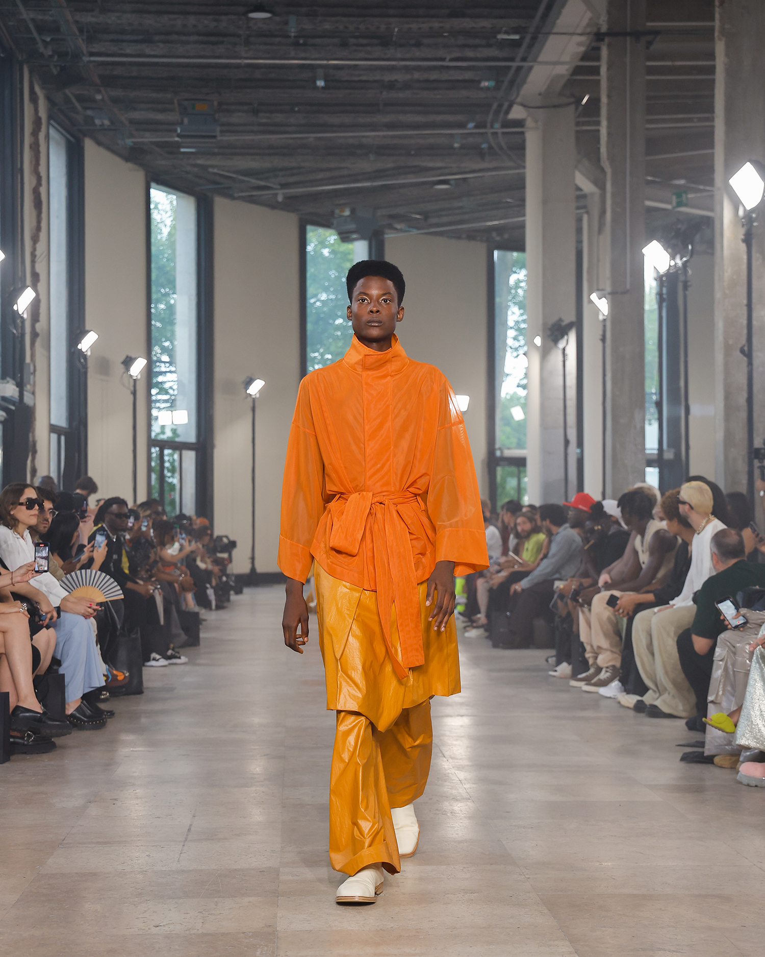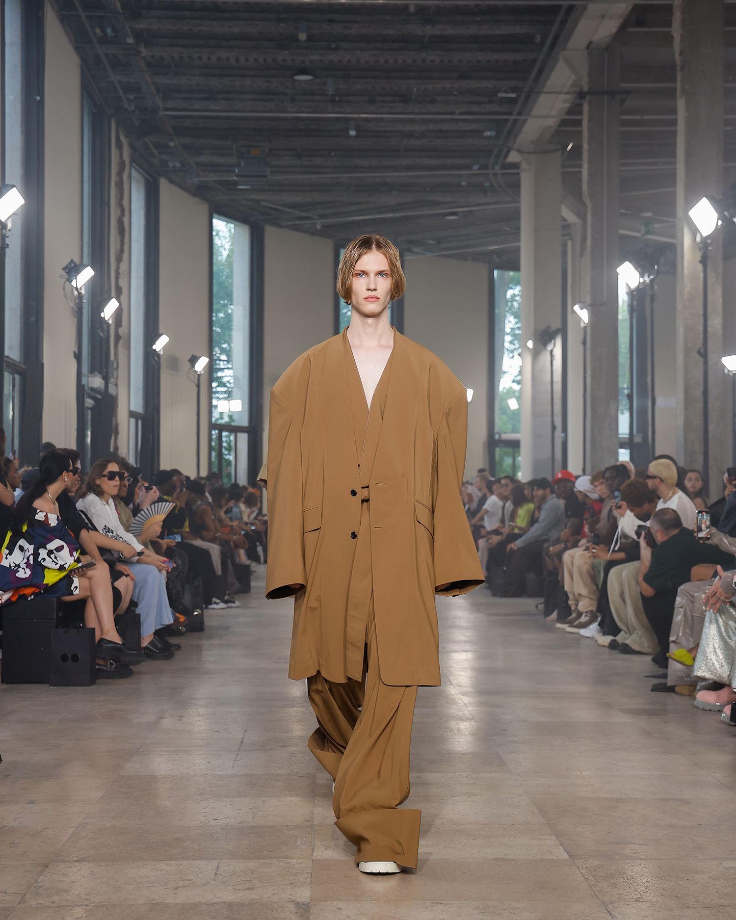 Pure Rebel은 ‘순수한 반역자’라는 뜻으로, 이를 컬렉션에서도 여실히 녹여냈다. 마치 갑옷을 모티브로 한듯한 디테일은 의상뿐만 아니라 신발에서도 확인할 수 있다. 컷아웃된 톱과 팬츠가 만들어내는 유니크한 실루엣, 집업 디테일 팬츠를 연출하는 방법, 리복과의 협업 제품까지. 밝은 희망에서 검은 물결로 이어지며 파리에 순수한 반역을 일으킨 SONGZIO의 2024년 S/S 컬렉션. 이로 미루어 보건대 ‘반역자’는 송재우 바로 본인이 아닐까.