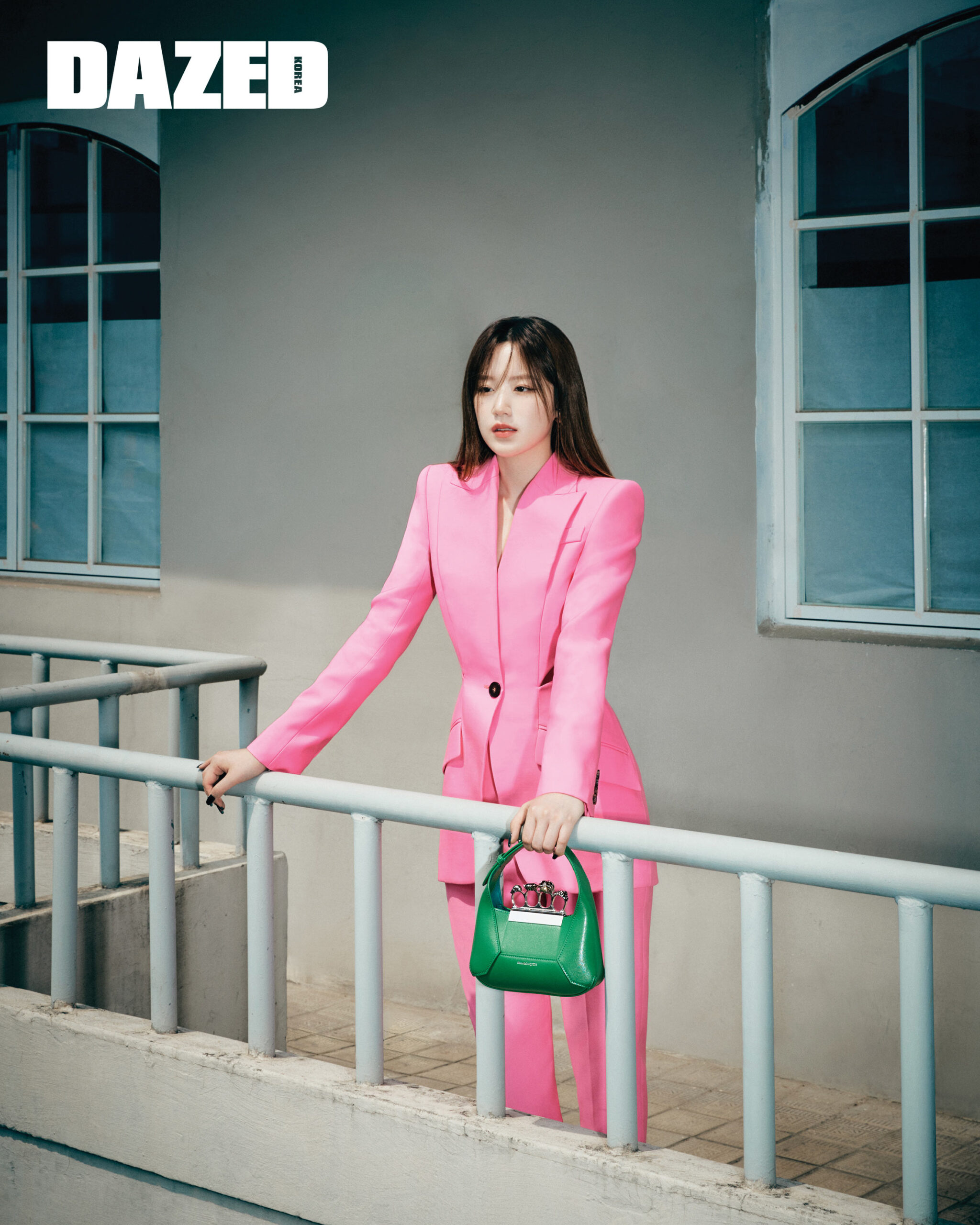 사이키델릭 핑크 컬러의 싱글브레스트 재킷과 롱 시가렛 팬츠, 패싯 스톤 디테일의 너클 장식이 돋보이는 그린 주얼 호보 미니 백은 모두 알렉산더 맥퀸(Alexander McQueen).
