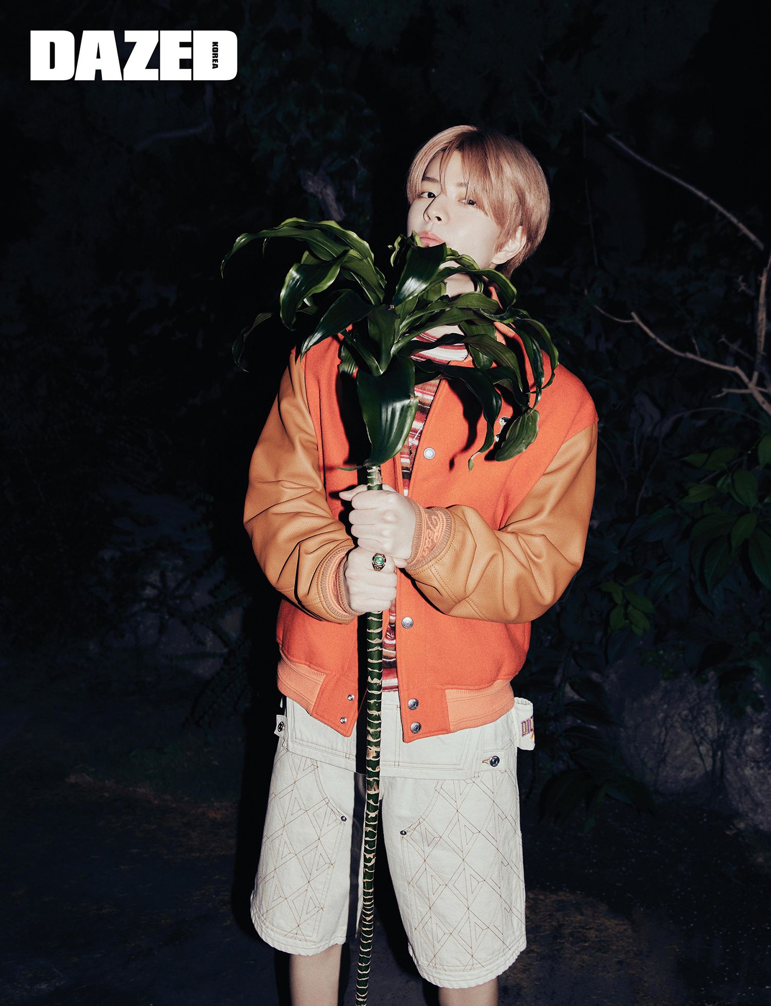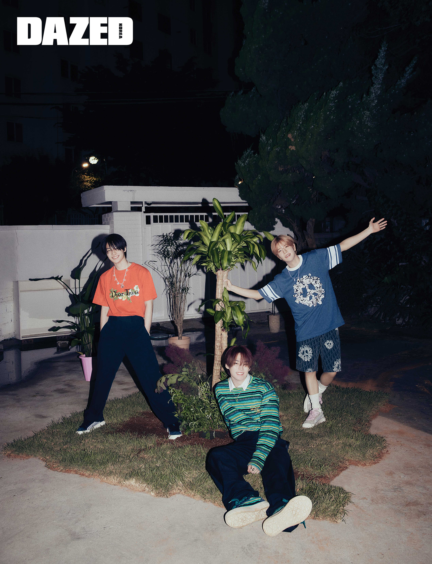 아이엔이 입은 DIOR TEARS 코튼 플라워 엠브로이더리 디테일의 레드 코튼 저지 티셔츠와 DIOR TEARS 라벨의 블루 코튼 트윌 팬츠, 블루 스웨이드, 디올 오블리크 자카드, 디올 오블리크 모티브가 새겨진 화이트 러버 솔 B33 테니스 스니커즈, 실버 피니시 브라스 & 블랙 코드 소재의 DIOR TEARS 피스 사인 펜던트 프레시 워터 펄 네크리스, 핸드페인팅 레진 소재의 DIOR TEARS 플라워 & 프레시 워터 펄 디테일의 멀티컬러 코드 브레이슬릿은 모두 디올 맨(Dior Men). 리노가 입은 블루 블렌드 코튼·모헤어·알파카 소재의 스트라이프 패턴 DIOR TEARS 엠브로이더리 크루넥 톱과 DIOR TEARS 피스 사인 엠브로이더리 디테일의 화이트 코튼 셔츠, 블루 울 & 모헤어 캔버스 소재의 체크 팬츠, 블루 스웨이드, 블루 모헤어 디올 오블리크 모티브가 새겨진 크림 러버 솔 B33 테니스 스니커즈, 골드 피니시 브라스 & 말라카이트 소재의 DIOR TEARS 펜던트 네크리스, 골드 피니시 브라스 & 말라카이트 소재의 DIOR TEARS 링은 모두 디올 맨(Dior Men). 승민이 입은 DIOR TEARS 피스 사인 엠브로이더리 디테일의 퍼플 저지 티셔츠와 올 오버 디올 오블리크 소재의 DIOR TEARS 피스 사인 프린트 블루 코튼 데님 쇼츠, 그레이 스웨이드, 디올 오블리크 자카드, 디올 오블리크 모티브가 새겨진 크림 러버 솔 B33 테니스 스니커즈, 멀티컬러 코드 & 핸드페인팅 레진 소재의 DIOR TEARS 플라워 펜던트 프레시 워터 펄 네크리스, 화이트 코튼 니트 삭스는 모두 디올 맨(Dior Men).