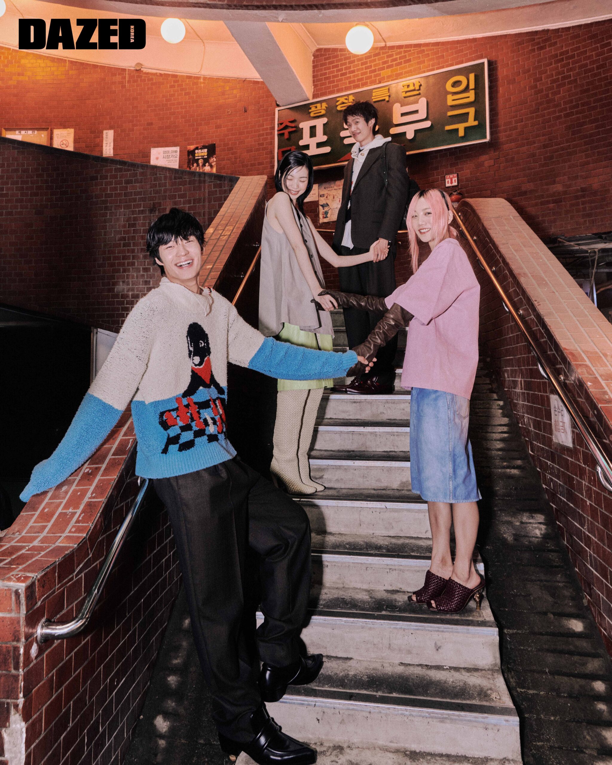 샹위가 입은 자수 디테일 울 자카르 스웨터와 울 팬츠, 카프스킨 클래식 로퍼는 모두 보테가 베네타(Bottega Veneta). 성진이 입은 레더 슬리브리스 드레스와 레더 슬릿 스커트, 인트레치아토 위빙이 돋보이는 사이하이 부츠, 라피스라줄리 소재 이어링은 모두 보테가 베네타(Bottega Veneta). 죠니가 입은 울 재킷과 팬츠 셋업, 자수 디테일 울 자카르 스웨터, 코튼 스트라이프 셔츠, 카프스킨 오픈 백 로퍼, 실크 타이, 인트레치아토 위빙 디테일 숄더백은 모두 보테가 베네타(Bottega Veneta). 승민이 입은 레더 티셔츠와 데님 프린팅 레더 스커트, 놋 디테일의 뮬 힐, 스털링 실버 이어링, 스털링 실버 네크리스, 레더 글러브는 모두 보테가 베네타(Bottega Veneta).