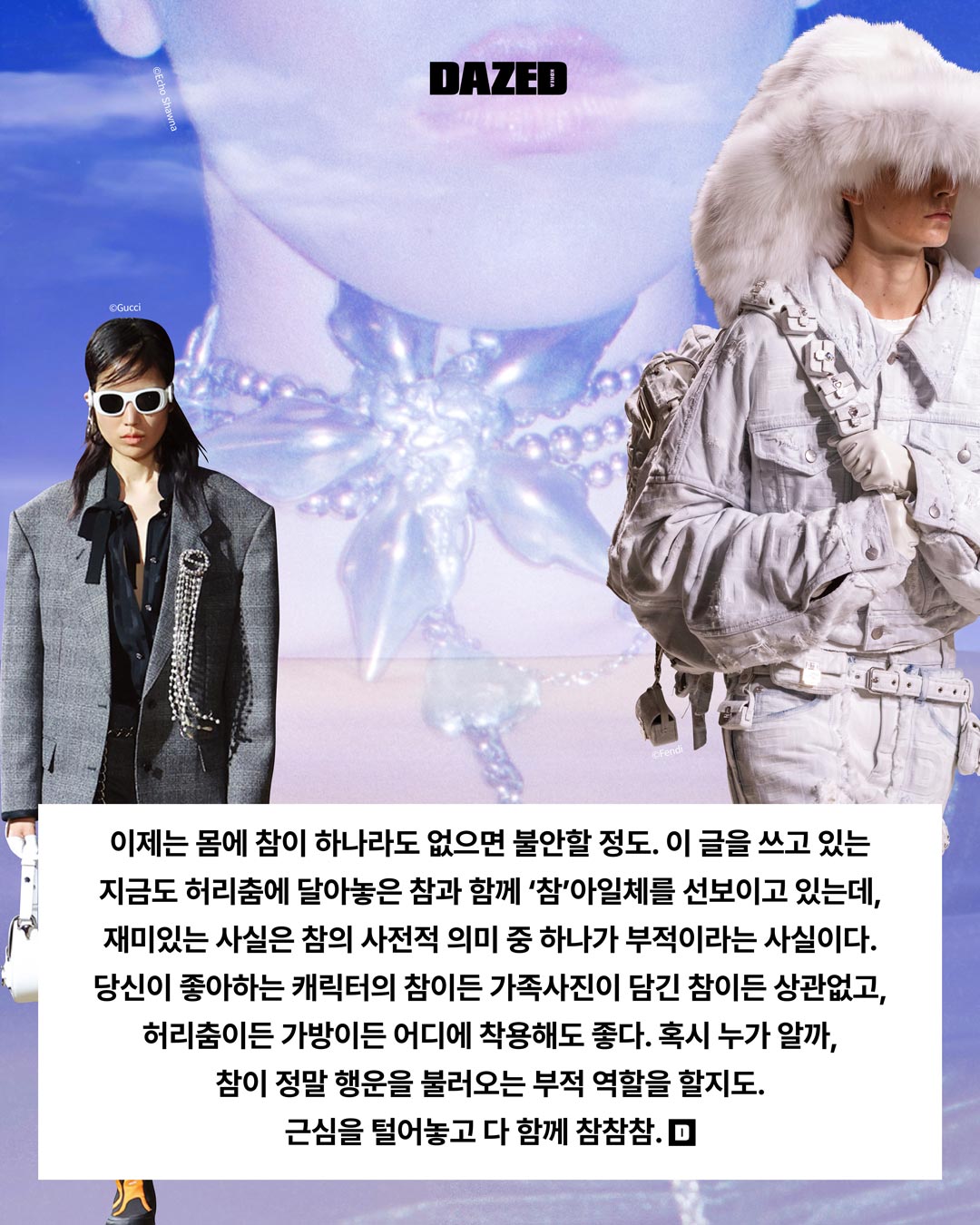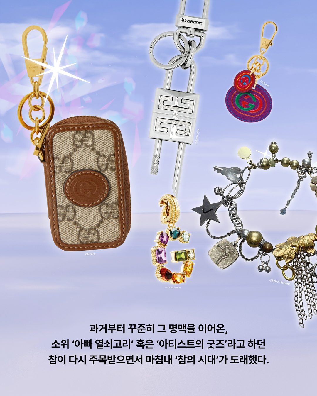 에어팟이 세상에 나옴과 동시에 가지각색의 에어팟 케이스가 쏟아져 나오던 때를 기억하는가. 샤넬과 프라다, 구찌, 루이 비통 등 럭셔리 하우스 브랜드들 역시 앞다퉈 다양한 에어팟 케이스를 출시했다. 하지만 한순간에 트렌드를 이끈 탓인지 그 인기는 금세 사그라졌다. 대신 과거부터 꾸준히 그 명맥을 이어온, 소위 ‘아빠 열쇠고리’ 혹은 ‘아티스트의 굿즈’라고 하던 참이 다시 주목받으면서 마침내 ‘참의 시대’가 도래했다.