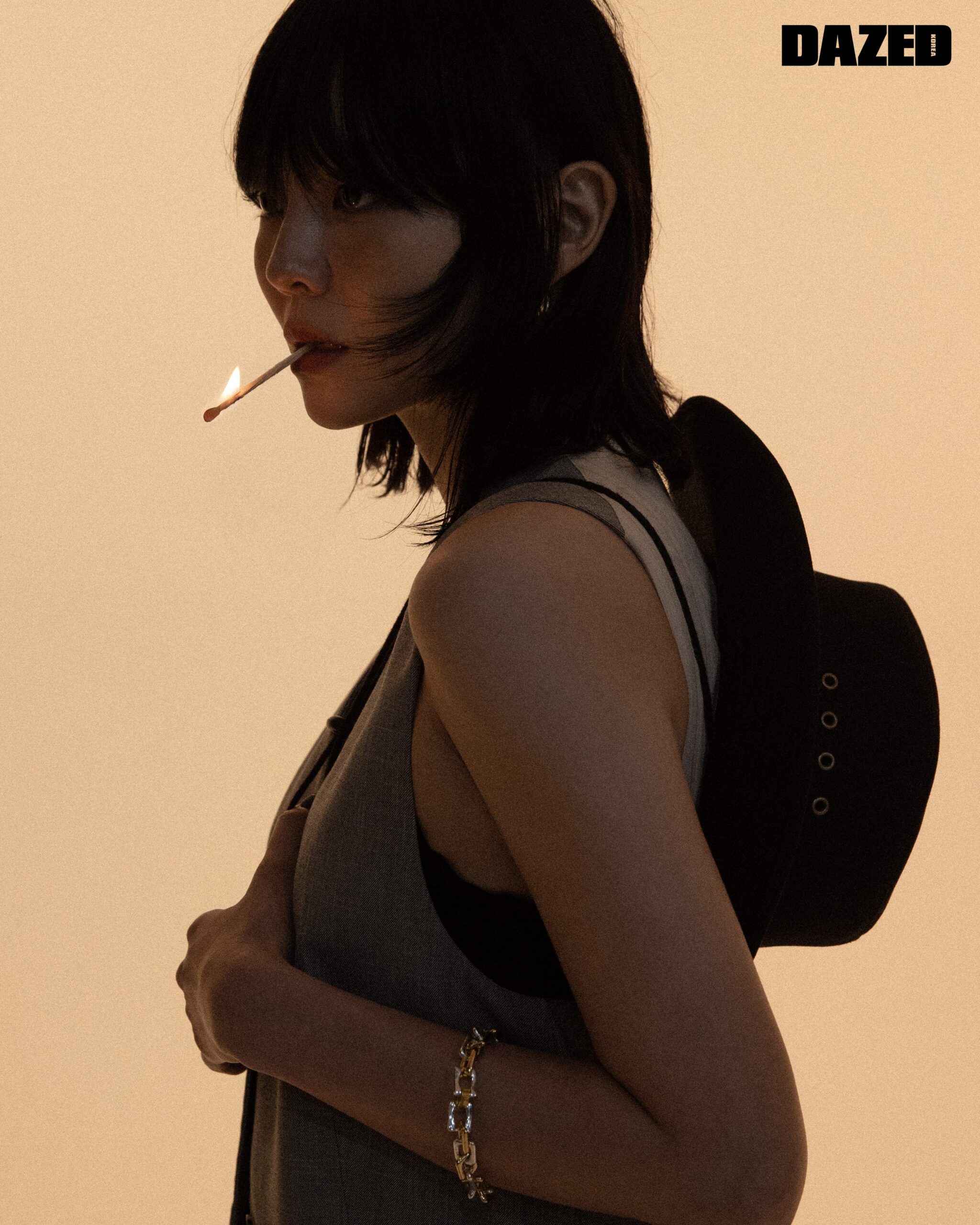 베스트는 렉토(Recto), 스웨이드 소재의 마이크로 미니스커트는 살바토레 산토로(Salvatore Santoro), 체인 브레이슬릿은 포트레이트 리포트(Portrait Report), 브라톱과 모자는 스타일리스트의 것.