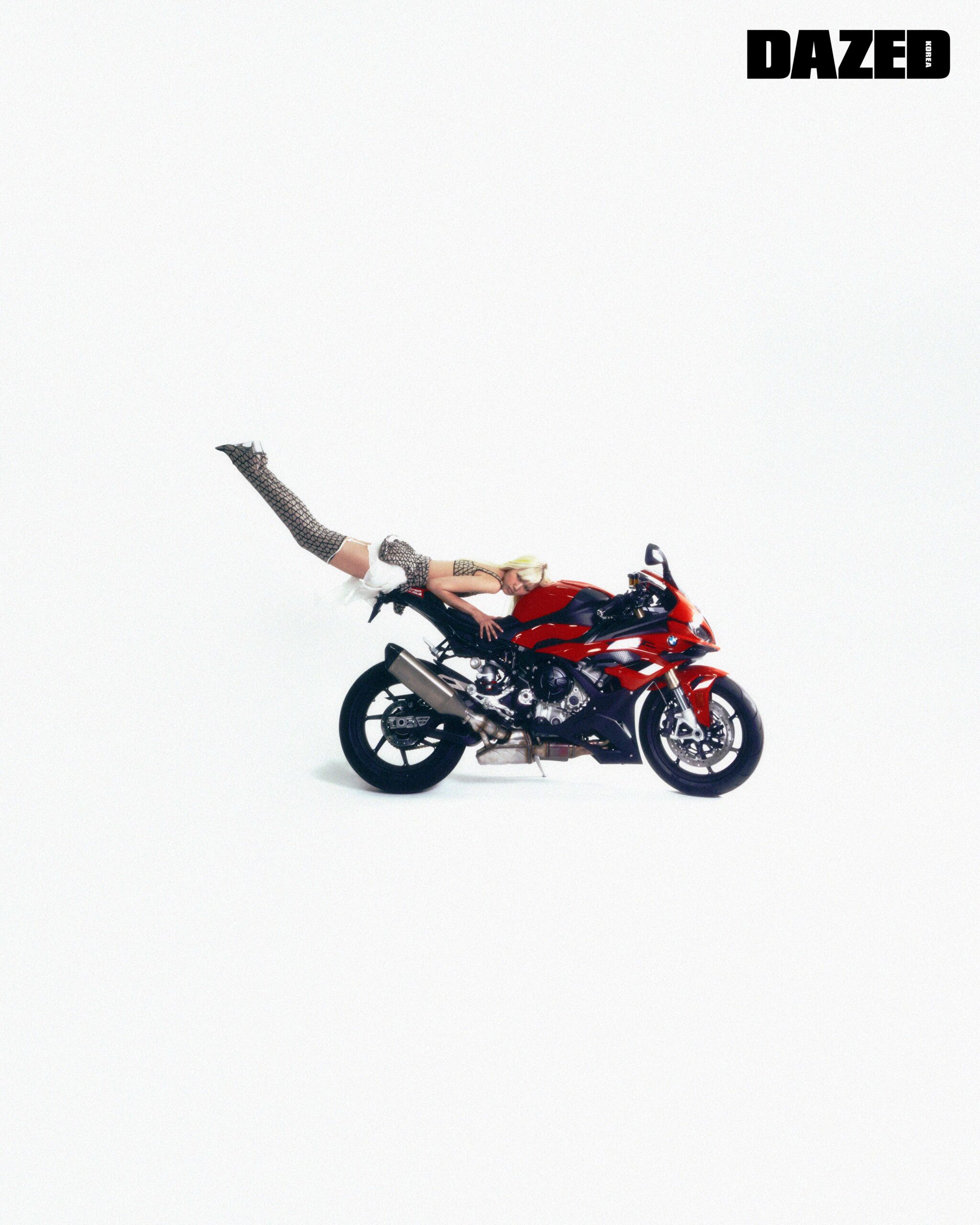 디스트레스드 더블 코르셋은 나타샤 징코 by 엠프티(Natasha Zinko by E( )PTY), 니트 소재의 트왈 이코노그라프 톱과 쇼츠 셋업은 발렌티노(Valentino), 트왈 이코노그라프 니 부츠는 발렌티노 가라바니(Valentino Garavani), 글러브는 에디터의 것.