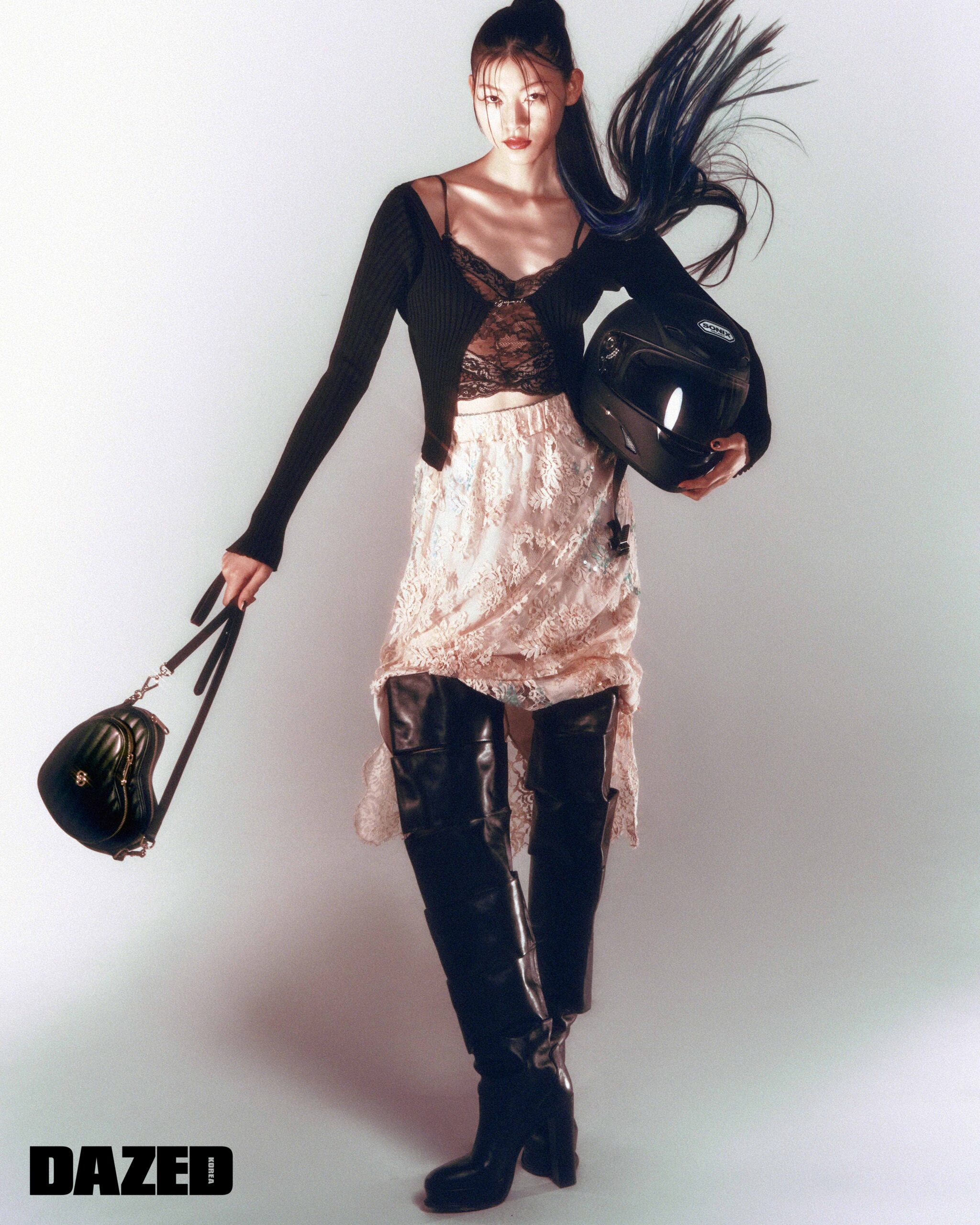 플리츠 디테일 카디건은 자크뮈스(Jacquemus), GG 엠브로이더리 블랙 레이스 보디슈트와 올오버 시퀸 디테일의 플라워 레이스 미디스커트, 더블 G 디테일의 하트 모양 숄더백은 모두 구찌(Gucci), 슬래시 디테일의 사이하이 부츠는 알렉산더 맥퀸(Alexander McQueen), 헬멧은 에디터의 것.