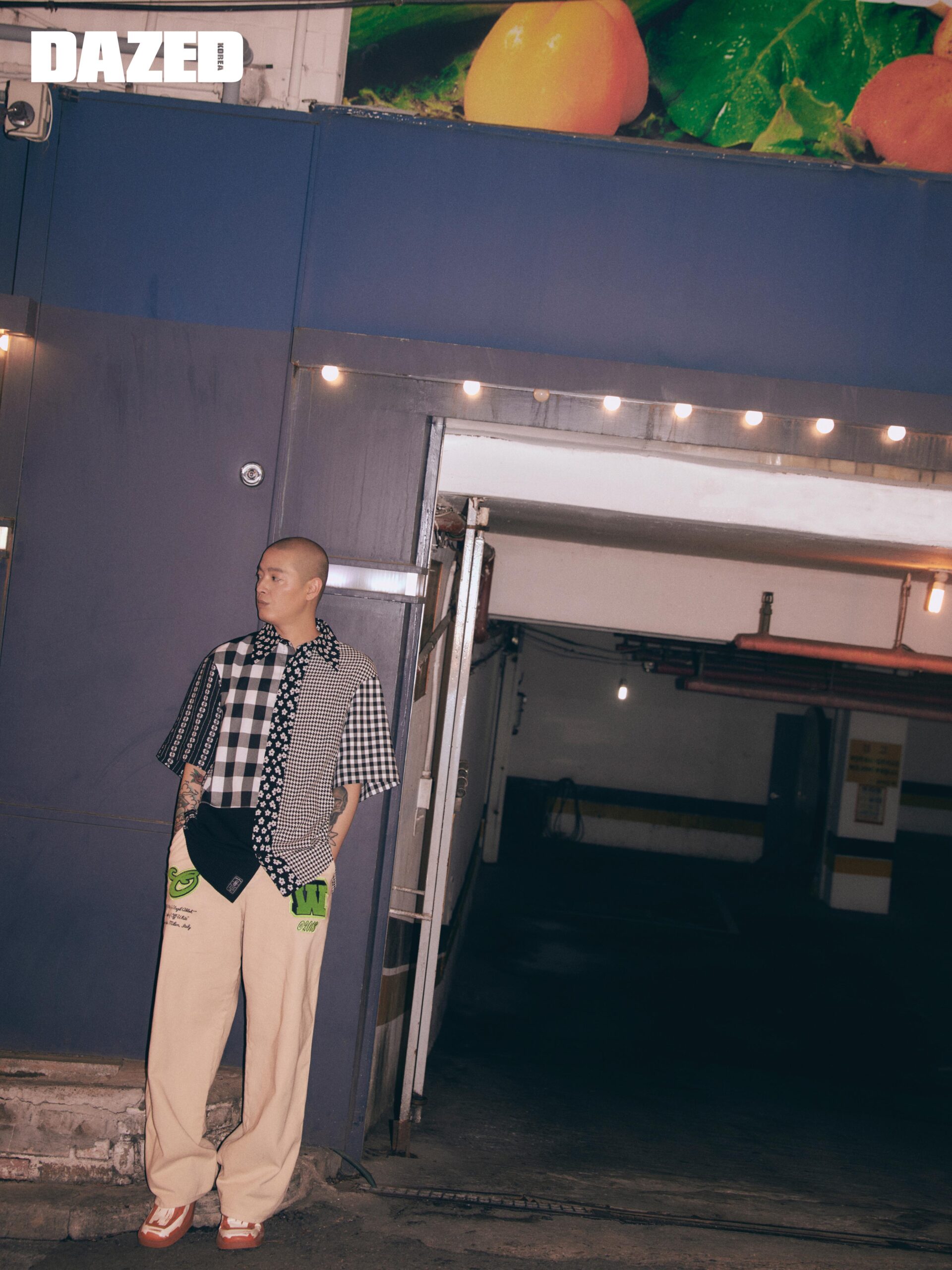 래글런 점퍼는 겐조(Kenzo), 패치워크 디테일의 하프 슬리브 셔츠는 아더에러(Ader).