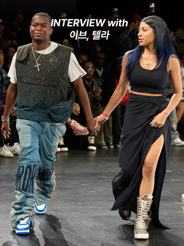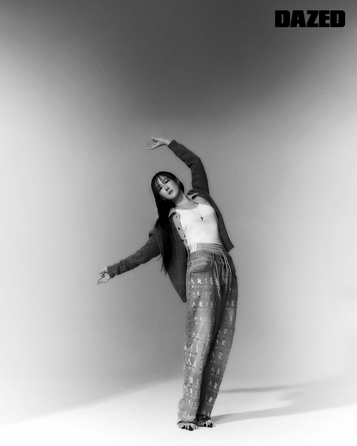 칼라 디테일 카디건은 스테판 쿡(Stefan Cooke), 슬리브리스 톱은 렉토(Recto), 레터링 데님 팬츠는 에리즈(Aries), 이너 팬츠는 아디다스(adidas), 블랙 스틸레토 힐은 스타일리스트의 것.