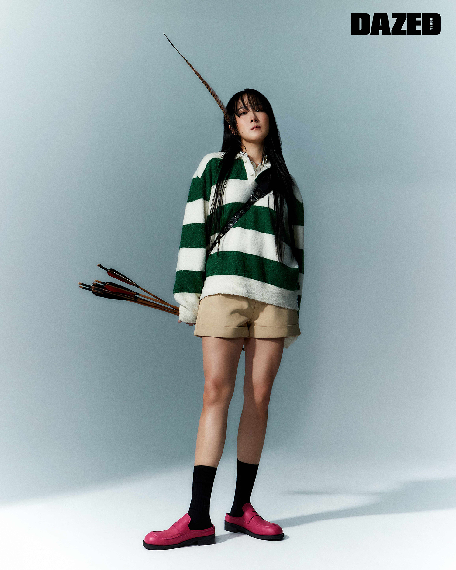 그린 스트라이프 니트 톱은 악셀 아리가토(Axel Arigato), 이너 셔츠는 크러쉬어게인(Crushagain), 베이지 쇼트 팬츠는 가니(Ganni), 블랙 레더 백은 발렌시아가(Balenciaga), 핫 핑크 뮬은 로맨틱무드(Romantic Mood), 삭스는 스타일리스트의 것.