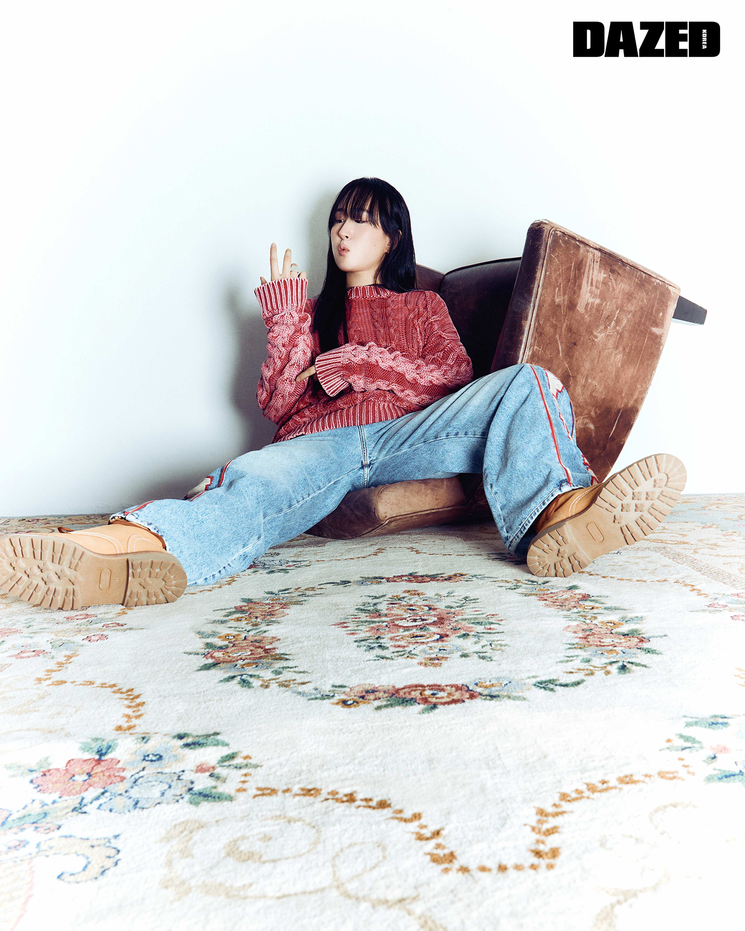 니트 톱과 에스닉 패턴 데님 팬츠는 디젤(Diesel), 부츠는 셀린느(Celine), 링은 이자벨 마랑(Isabel Marant).