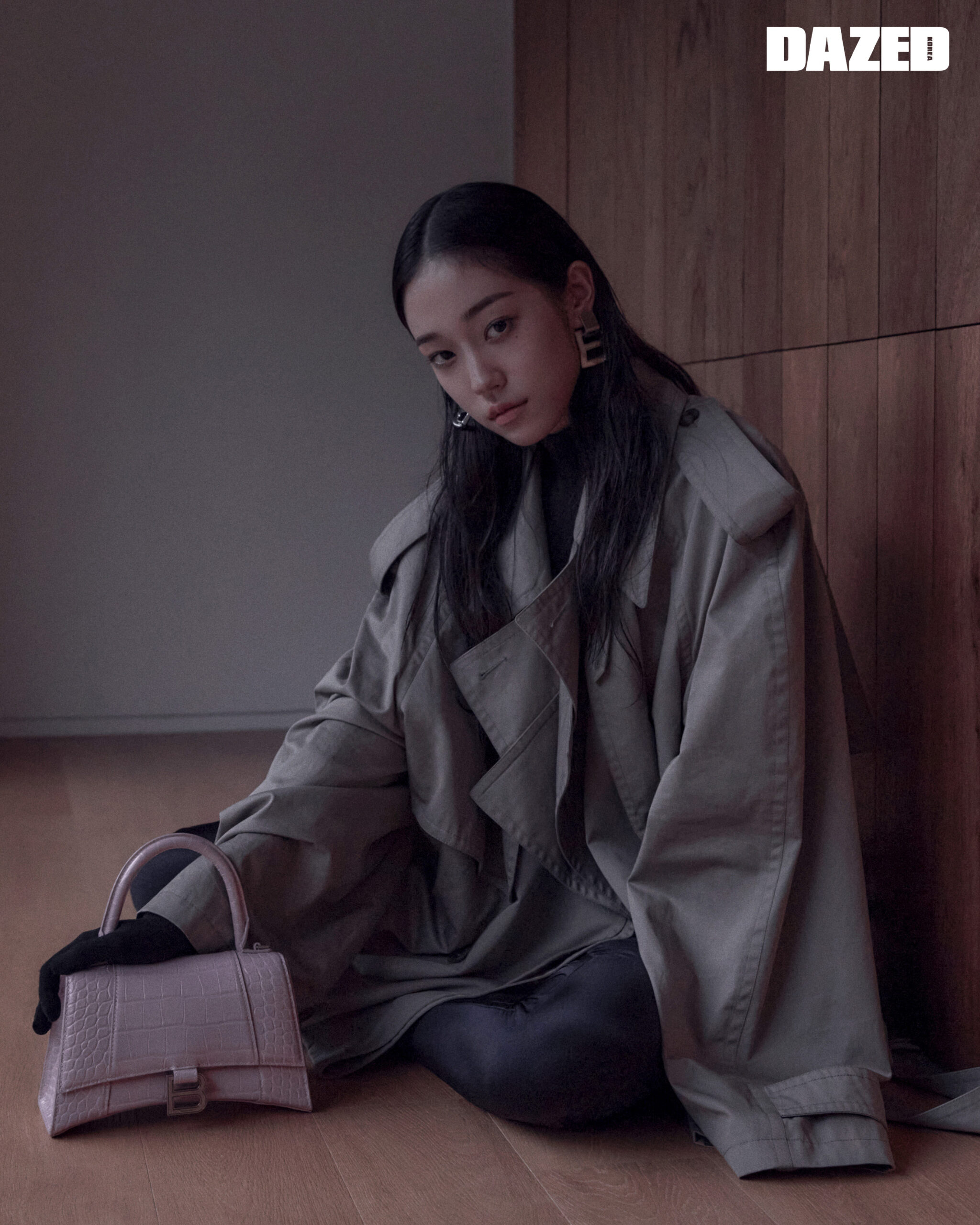 폴디드 트렌치코트와 글러브 스웨터 톱, 나이프 판타 레깅스, 아워글래스 크래쉬 이어링, 파우더 핑크 컬러 아워글래스 스몰 백은 모두 발렌시아가(Balenciaga).