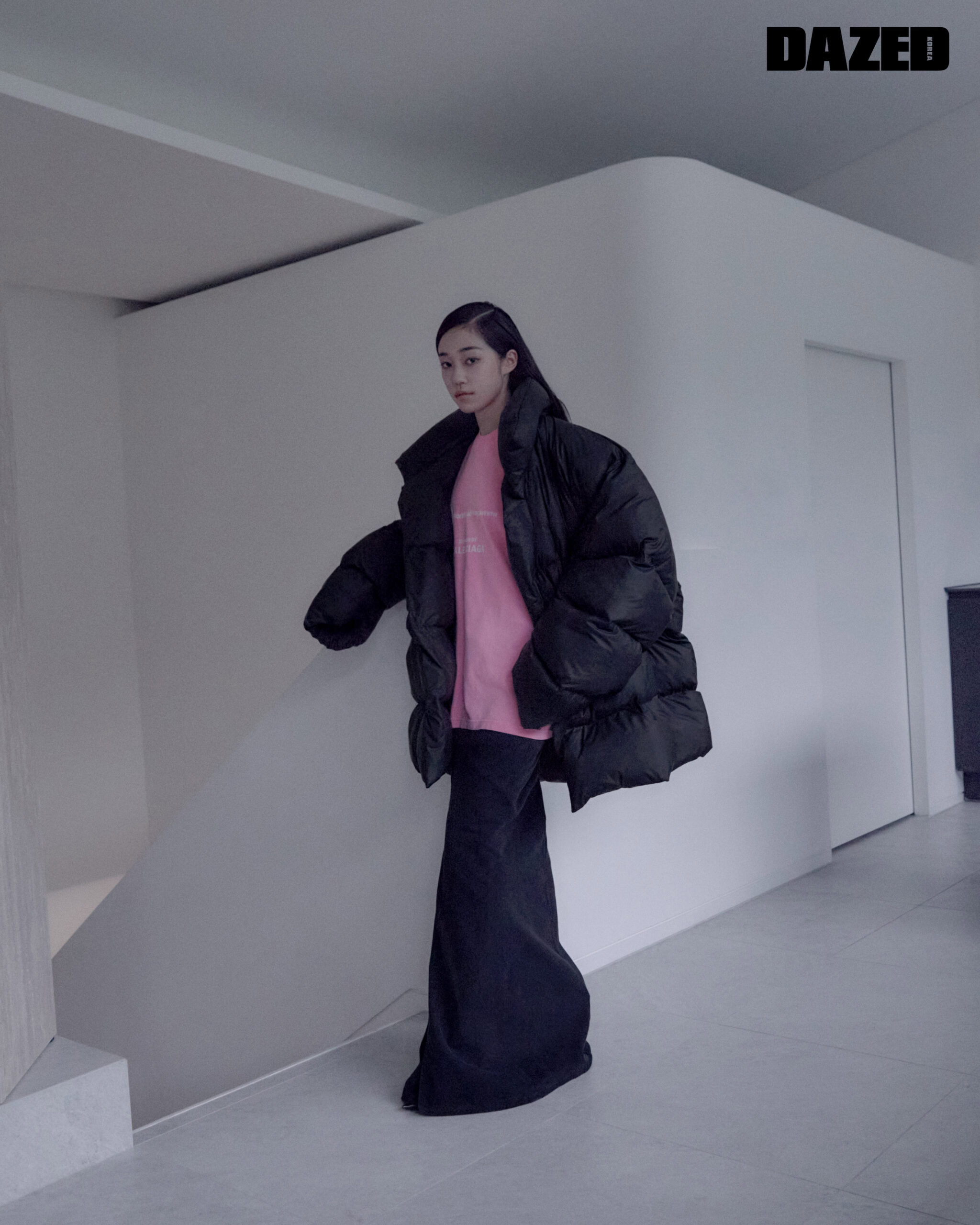 WFP 핑크 빈티지 저지 티셔츠와 랩 푸퍼 재킷, 맥시스커트는 모두 발렌시아가(Balenciaga).