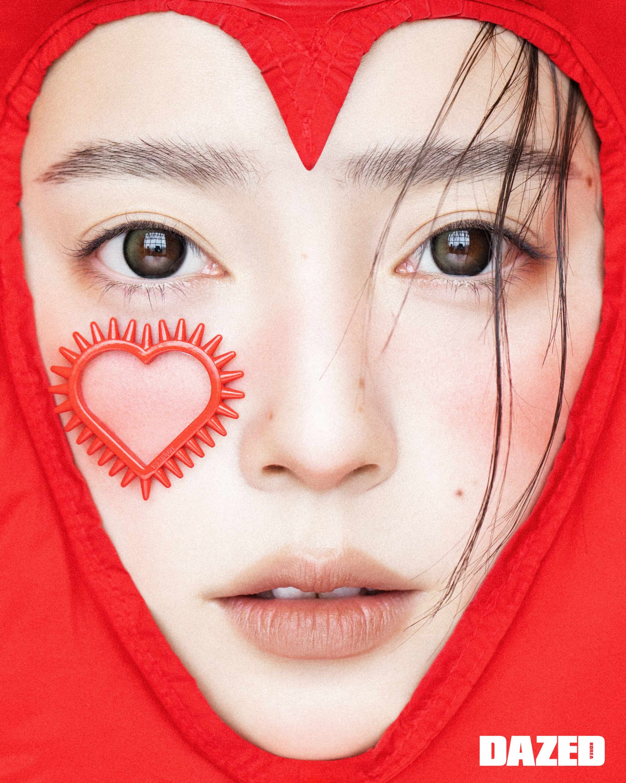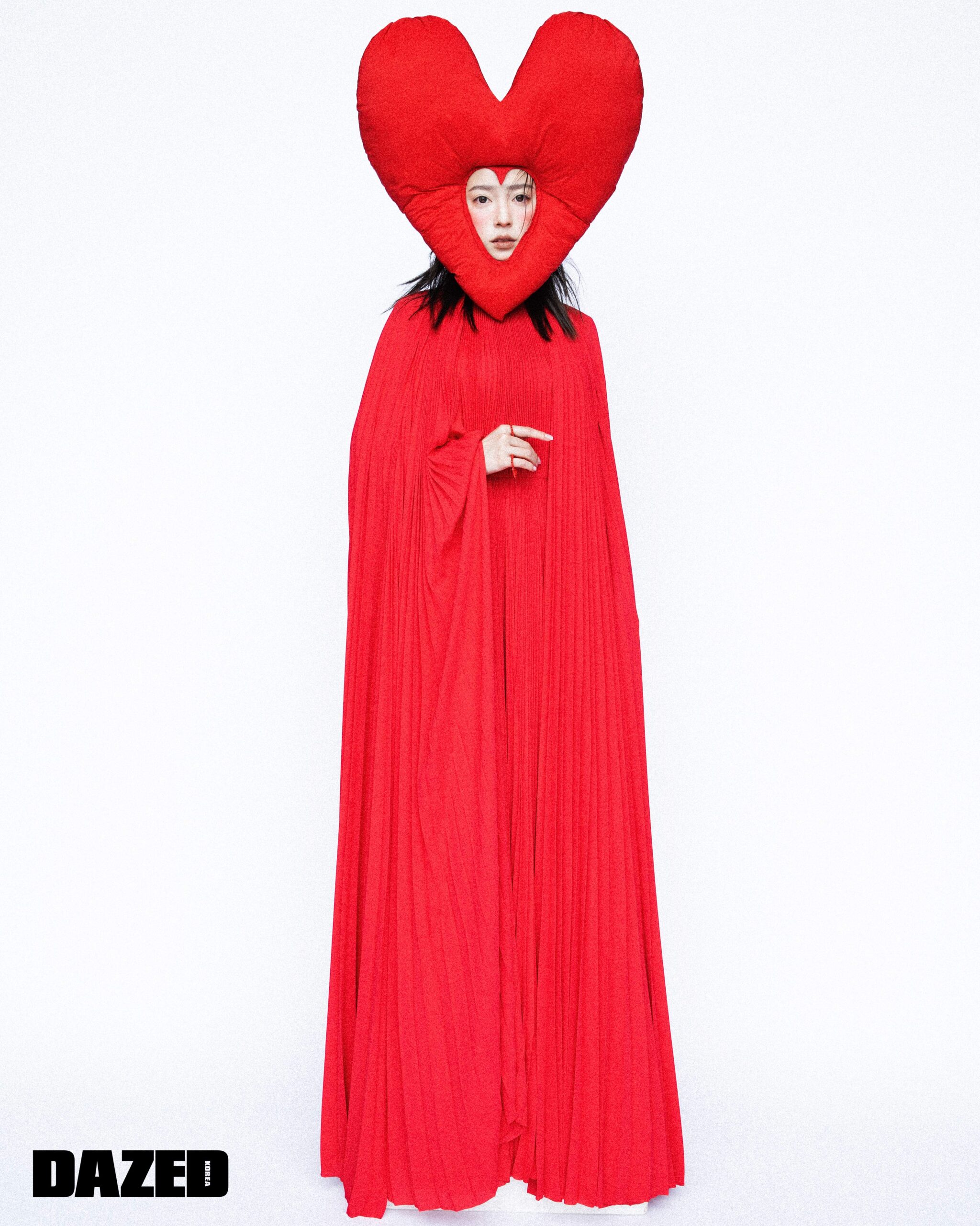 맥시 케이프 드레스는 발렌시아가(Balenciaga), 하트 헤드피스는 지미(Jimi), 스파이크 하트 링은 모두 웰던(We11done).