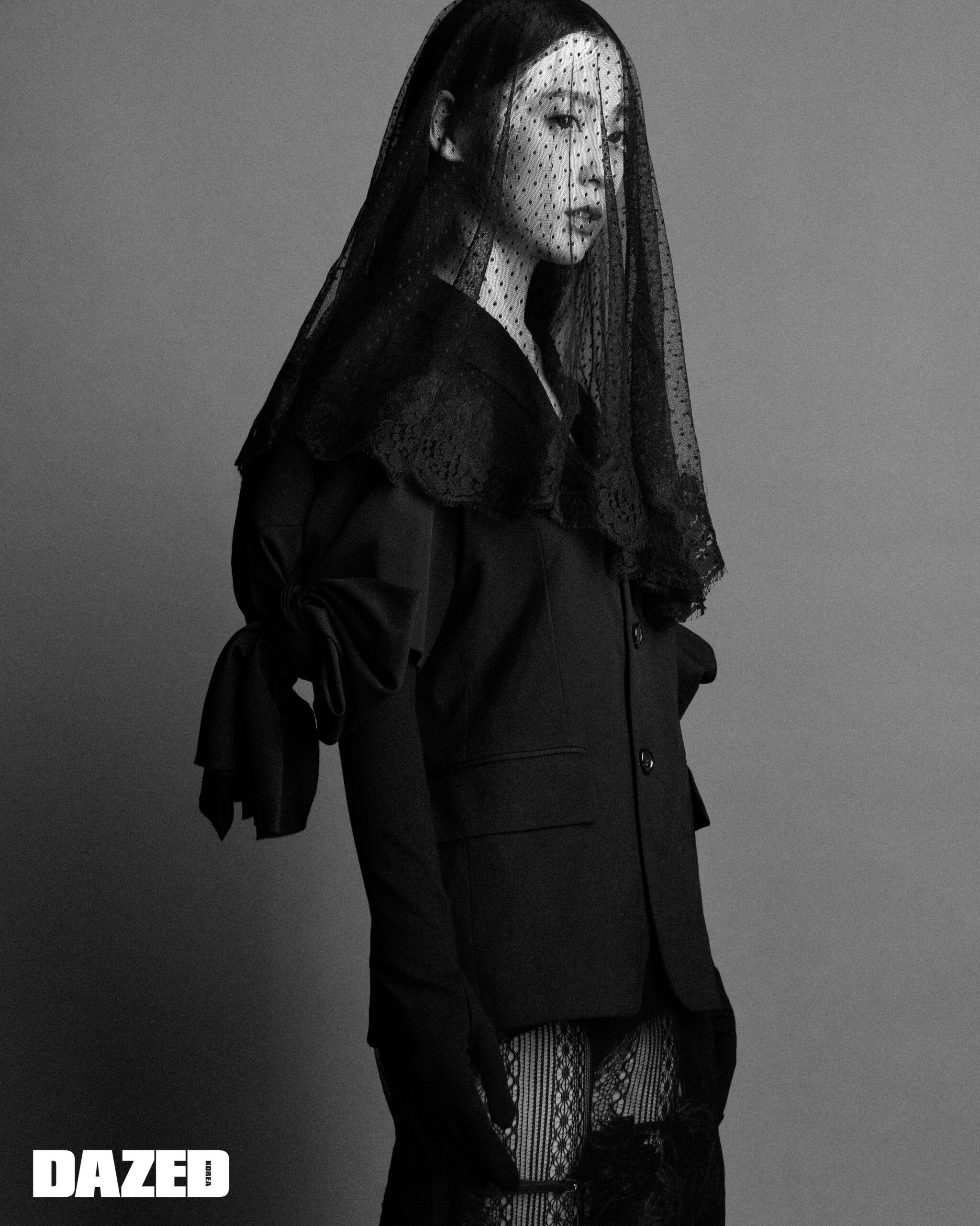 리본 디테일 하프 슬리브 재킷은 꼼데가르송(Comme des Garçons), 시스루 스커트는 메종 마르지엘라(Maison Margiela), 페더 디테일 스트랩 롱부츠는 세르지오 로시(Sergio Rossi), 시스루 베일과 롱 글러브는 돌체앤가바나(Dolce&Gabbana), 타이츠는 에디터의 것.