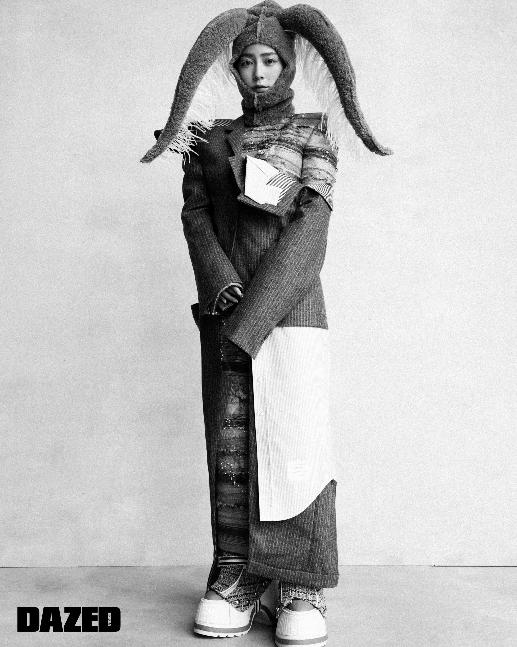 언밸런스 스트라이프 롱 코트와 비즈 디테일 맥시 드레스, 플랫폼 부츠는 모두 톰브라운(Thom Browne), 버니 헤드피스는 지미(Jimi).