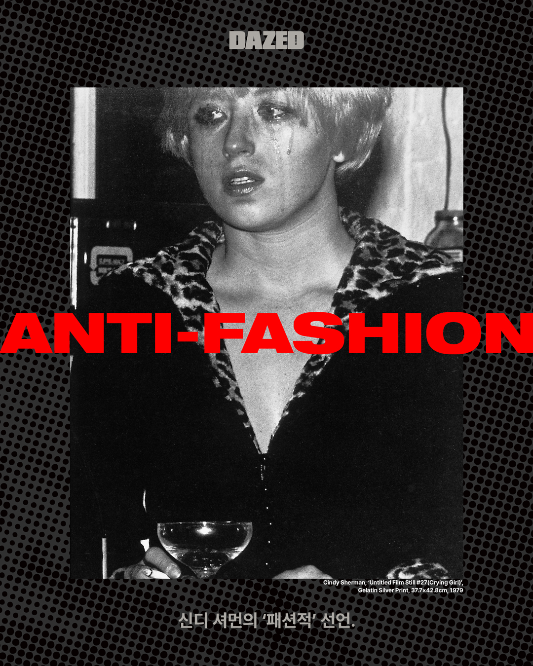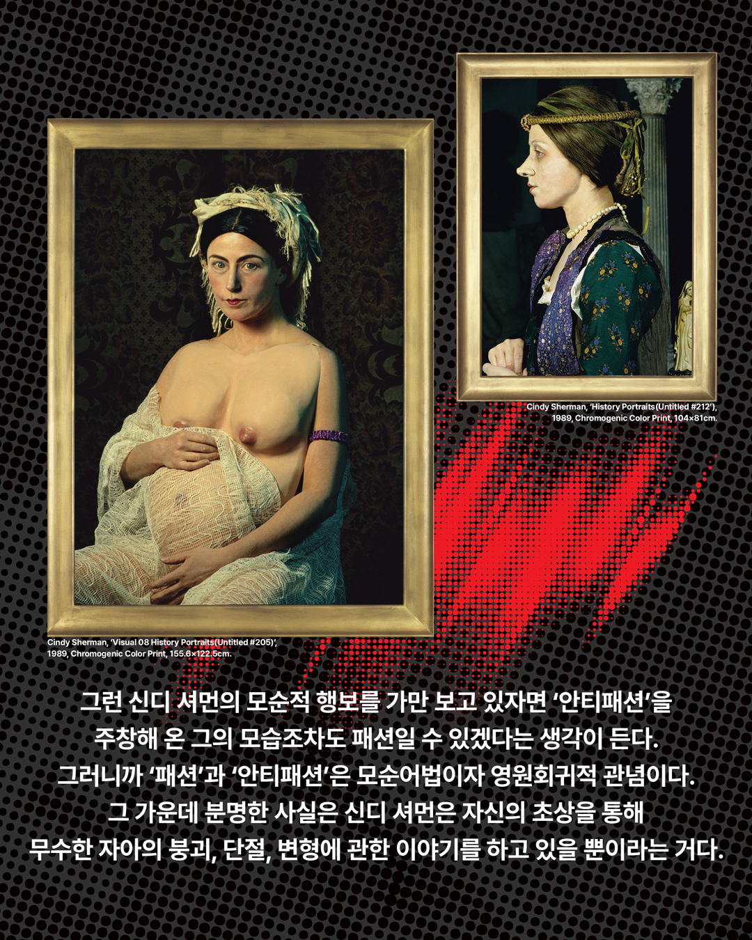 패션을 둘러싼 무수한 개념적, 사회적인 쟁점과 질문을 잘 이해하고 활용한 사진 작가가 있다. ‘천의 얼굴’ 신디 셔먼의 시도와 태도가 그렇다. 광고, 영화 등 대중 이미지 속이 아닌 직접 그 자신의 피사체가 되어 무수한 초상을 남긴 신디 셔먼. 그는 수많은 분장과 재창조를 통해 사진 속에서 다른 시대, 다른 사람으로 산다. 무엇보다 그가 ‘여성’으로서 재현한 여성의 모습들은 전형적인 여성상에서 벗어났다거나 남성 중심의 가부장적 이데올로기 속 가려진 여성의 모습들을 폭로한다는 의미로 해석되면서, 그의 작품은 20 세기 미국, 대중 매체와 대량 이미지들이 범람하던 시대를 역행하며 특히 페미니즘적 비평가들에게 큰 호응을 얻는다. (정작 신디 셔먼 자신은 그리 달가워 하지 않았다는 풍문이 있다.) 그가 의문을 제기하고 풍자한 문제 중엔 응당 패션도 빠지지 않았다. 그런데 그는 종종 패션 매거진에 모델로 등장하거나 루이비통, 꼼 데 가르송, 발렌시아가 등 패션 브랜드와 긴밀한 협업 관계를 보이기도 했다. 물론 패션 모델의 매끄럽고 잘 빠진 몸매에 대한 반향으로, 으레 A컷이라 불리는 이미지와는 한참 동떨어진 모습으로 말이다. 그런 신디 셔먼의 모순적 행보를 가만 보고 있자면 ‘안티 패션’을 주창해온 그의 모습조차도 패션일 수 있겠다는 생각이 든다. 그러니까 ‘패션’과 ‘안티 패션’은 모순어법이자 영원회귀적 관념이다.