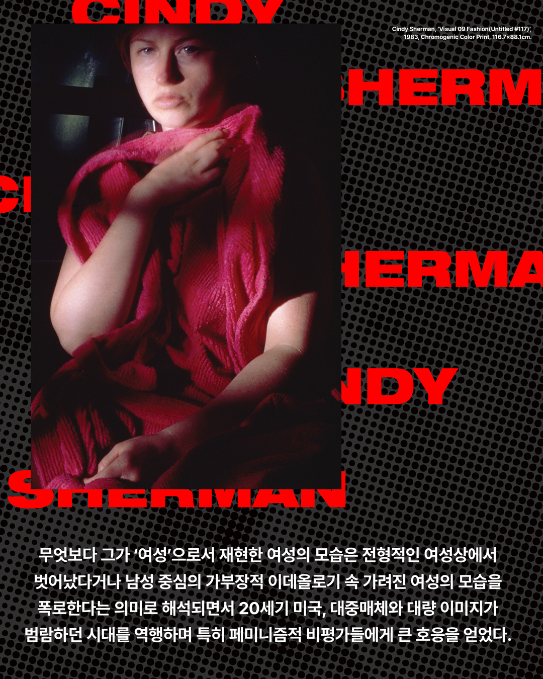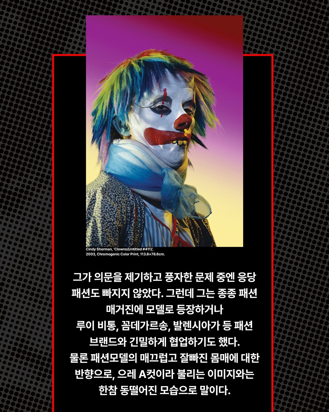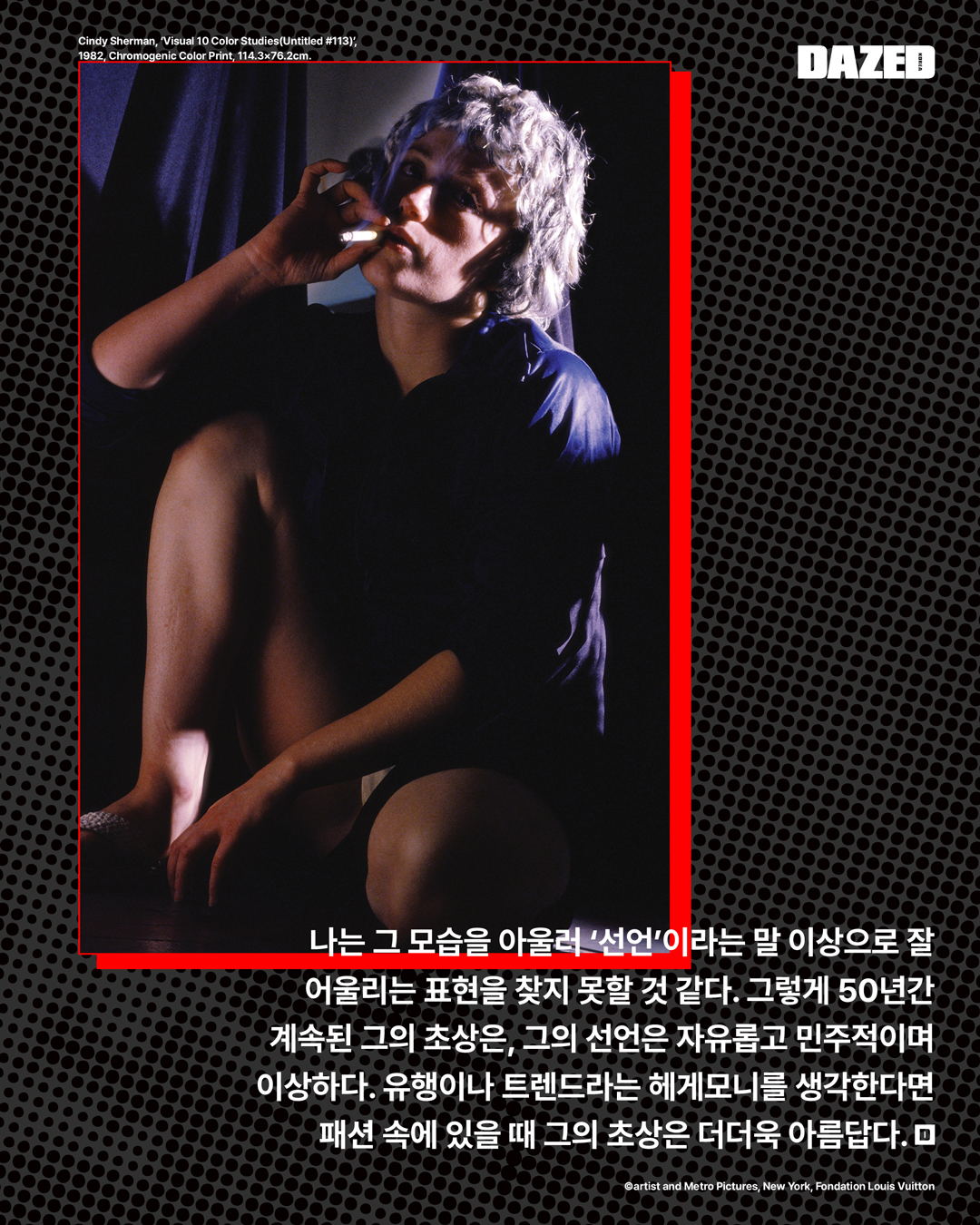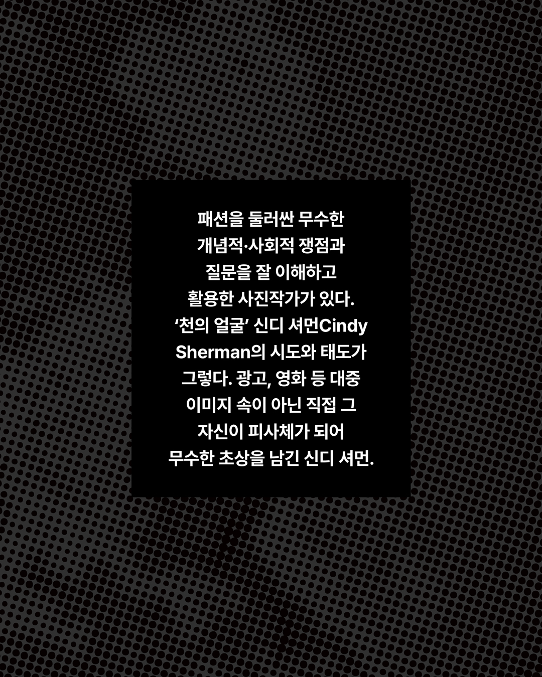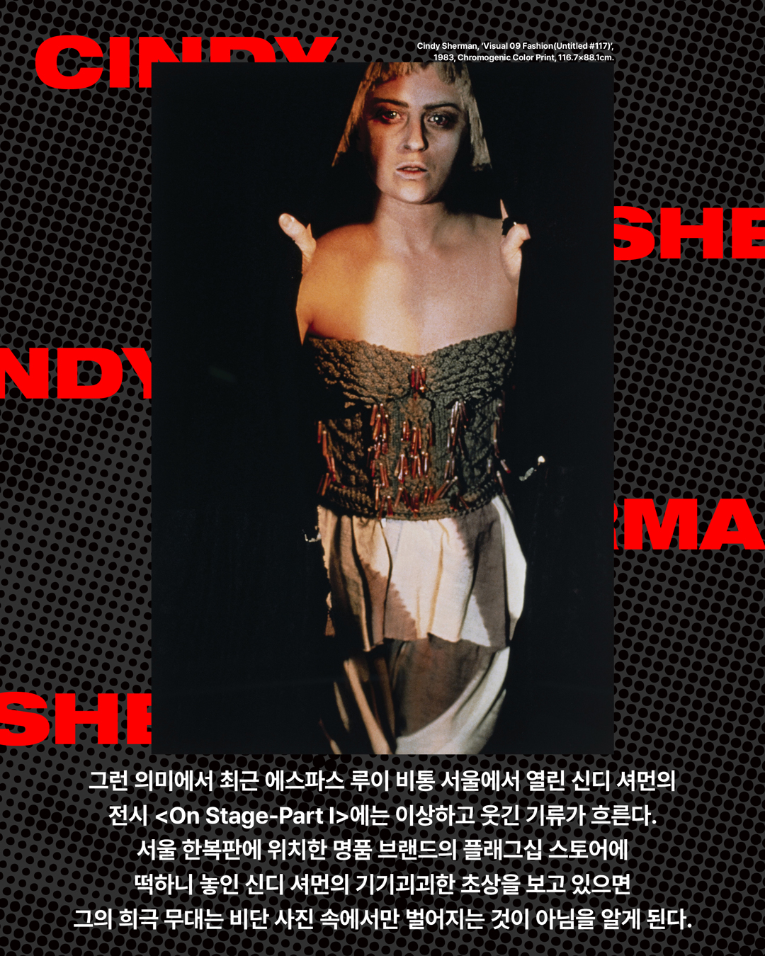 그런 의미에서 최근 에스파스 루이 비통 서울에서 공개된 신디 셔먼의 전시 에는 이상하고 웃긴 기류가 흐른다. 서울 한복판에 위치한 명품 브랜드의 플래그십 스토어에 떡하니 놓인 신디 셔먼의 기기괴괴한 초상을 가만 보고 있자면 그의 희극 무대는 비단 사진 속에서만 벌어지는 것이 아님을 알게 된다. 나는 그 모습을 아울러 선언이라는 말 이상으로 어울리는 표현을 찾지 못할 것 같다. 그렇게 50년 간 계속된 그의 초상은, 그의 선언은 자유롭고 민주적이며 이상하다. 유행이나 트렌드라는 헤게모니를 생각한다면 패션 속에 있을 때 그의 초상은 더더욱 아름답다. 그래서 또한 안티 패션이다.