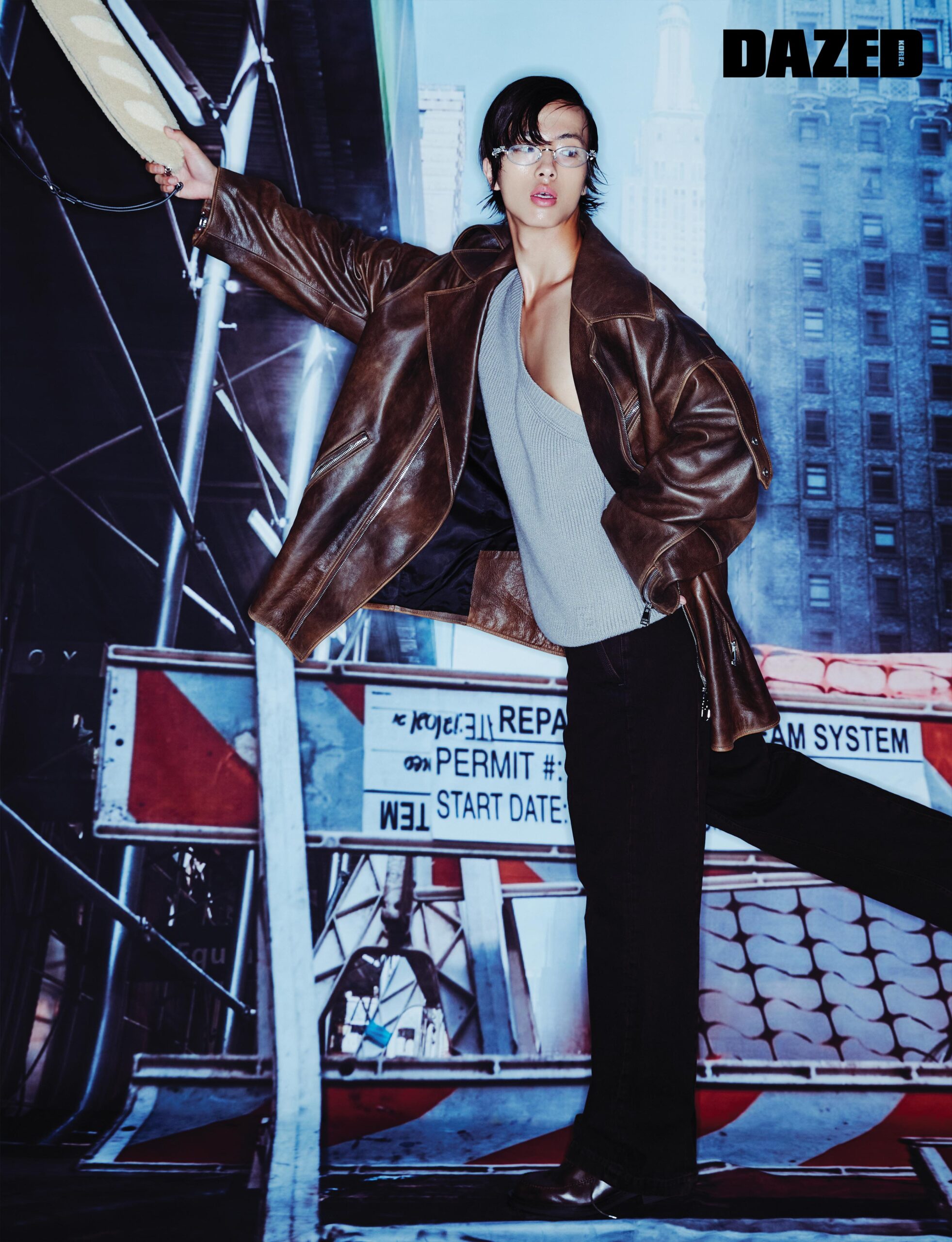 레더 바이커 재킷과 니트 베스트, 트라우저, 로퍼, 바게트 백은 모두 펜디(Fendi), 안경은 젠틀 몬스터 × 데이제르(Gentle Monster × D’heygere).