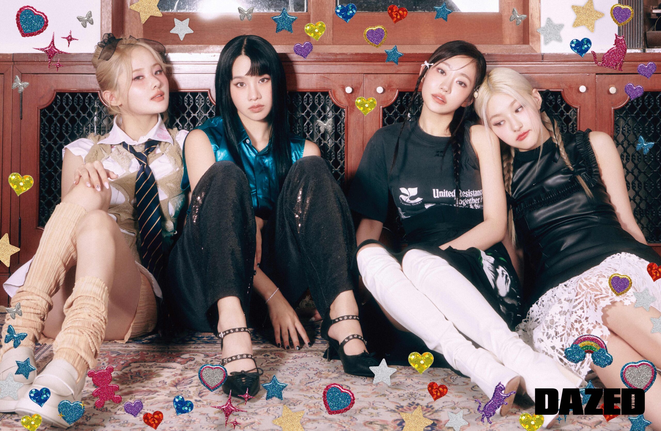 이 입은 바이커 쇼츠와 롱 삭스는 아크네 스튜디오(Acne Studios), 슈즈는 캠퍼(CAMPER), 화이트 셔츠와 니트 베스트, 넥타이는 모두 에디터의 것. 나띠가 입은 글리터 디테일 와이드 팬츠는 골든구스(Golden Goose), 메탈릭 셔츠와 블랙 펌프스, 브레이슬릿은 모두 에디터의 것. 쥴리가 입은 그래픽 프린트 롱 드레스는 꾸레쥬(Courrèges), 허리에 묶어 연출한 티셔츠와 화이트 롱부츠는 에디터의 것. 하늘이 입은 프릴 디테일 드레스는 팜 엔젤스(Palm Angels), 레이스 스커트는 올세인츠(Allsaints).