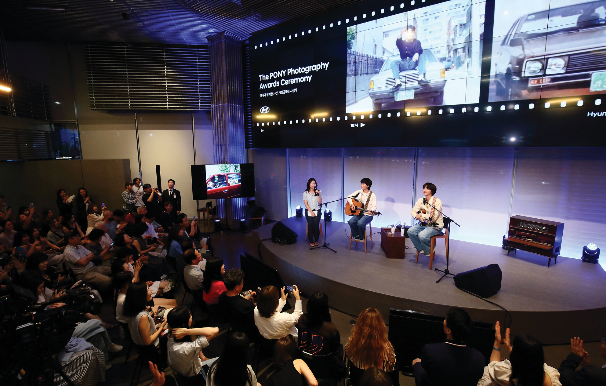 7월 22일 현대 모터스튜디오에서 열린 ‘포니 사진 공모전’ 특별 공연에 참석한 잔나비 최정훈, 김도형과 사회자인 현대자동차 최지연 매니저.