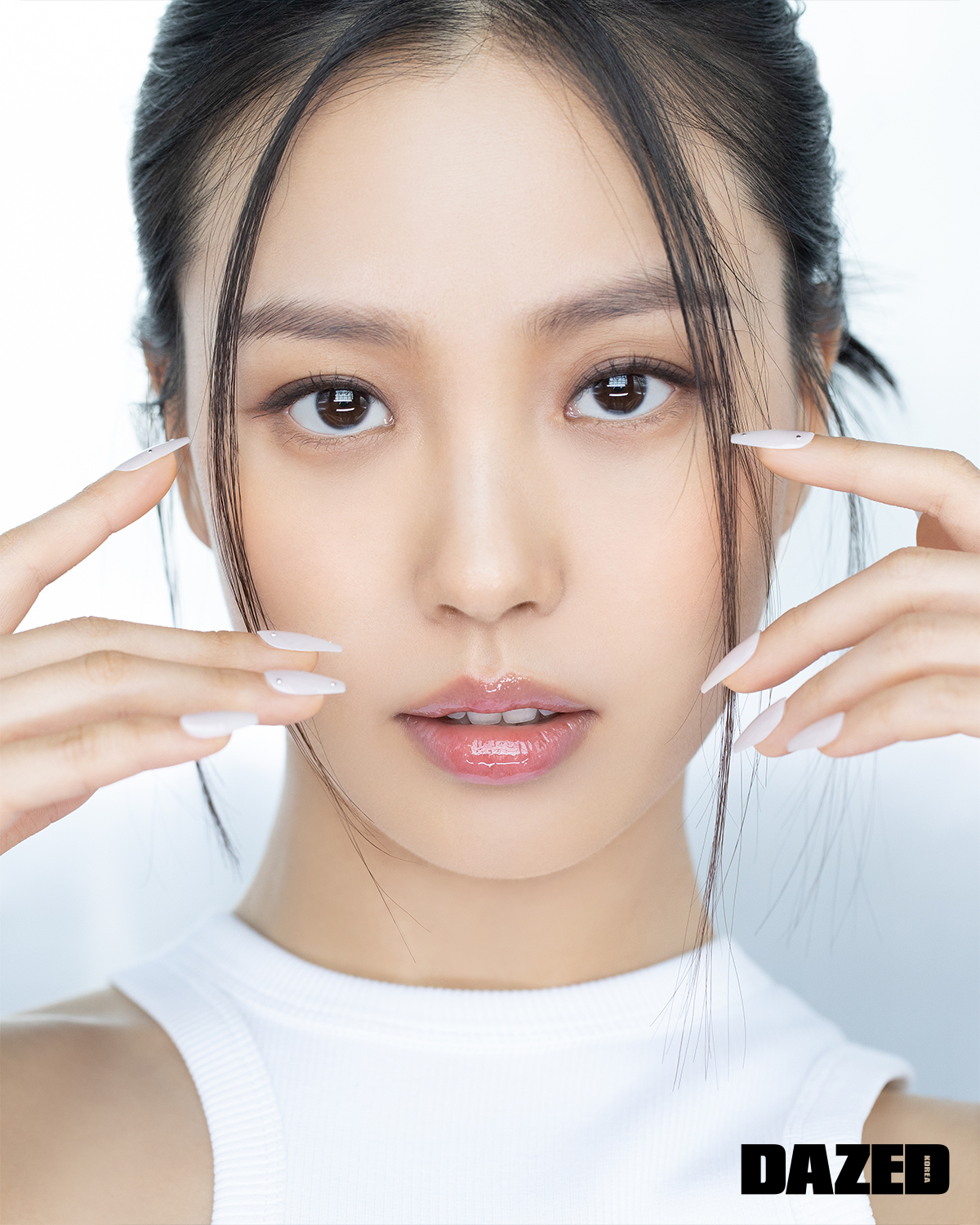 슬리브리스 톱은 악셀 아리가토(Axel Arigato), 네일 팁은 핑거수트(Finger Suit).