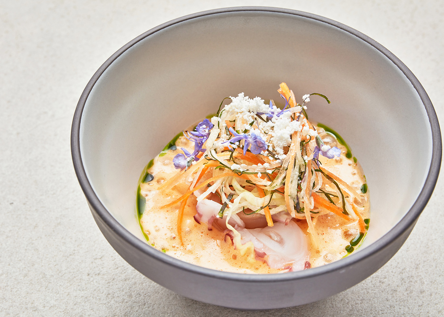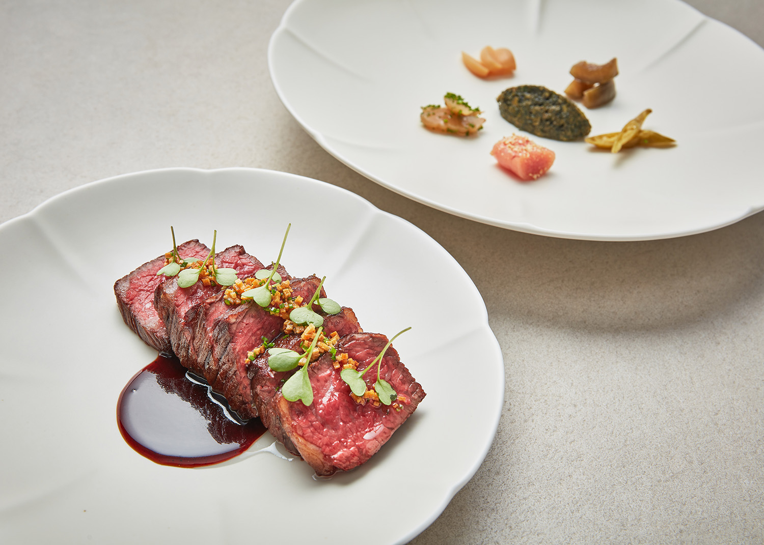 12코스의 여정은 다섯 가지 식전 카나페로 시작한다. 간장에 절인 새우에 유자 퓌레와 바다 포도 그리고 바삭한 백 다시마를 곁들인 타르트 ‘새우장’. 10년 숙성 간장으로 양념한 소고기 주먹밥 튀김에 검은 송로 버섯 슬라이스를 얹은 ‘불고기’. 진한 고추장으로 닭고기를 볶은 뒤 다양한 야채, 견과류 그리고 고수를 더 해 얇은 프랑스식 크루스타드에 담은 ‘닭갈비’. 한국형 소고기 와규 타르타르와 한국 배, 아브루가 캐비어를 브리오슈 위에 얹은 ‘육회’ 그리고 매콤하게 양념 된 김으로 참치 뱃살과 김치, 해삼을 감싼 카넬로니 ‘김말이’. 5종의 식전 요리는 경험하는 이로 하여금 한식에 대한 새로운 관점을 갖게 한다. 여정은 6번째 코스로 이어지며 오징어, 옥수수, 현미 그리고 감자가 들어간 오래전부터 인기 있는 궁중 요리 ‘옥수수 타락죽’이 나온다. 7번째 코스는 ‘전복찜’으로 계란찜과 함께 나오는 전복에 연어알과 팽이버섯을 곁들인다. 이어지는 8번째 코스는 ‘물회’로 시원하고 매콤한 고추장 국물에 도미 회와 문어가 들어있다. 9번째 코스 ‘삼치구이’는 부산에서 공수한 삼치에 쌈장, 고추, 쪽파 등으로 만들어진 3가지 소스를 얹는다. 10번째이자 메인 코스인 ‘갈비’는 간장, 마늘로 양념한 특급 와규를 58도에서 한 시간 동안 천천히 구워낸 것으로 숙성된 한국식 콩디망 ‘반찬’과 함께 제공된다. 여정을 기념하는 깜짝 디저트 ‘후식’은 한국에서 영감을 받아 만들어졌다. 흑임자 마카롱, 대추 로셰, 홍삼 캐러멜 그리고 산딸기로 이루어진 프티 푸르 ‘다과’로 마무리.