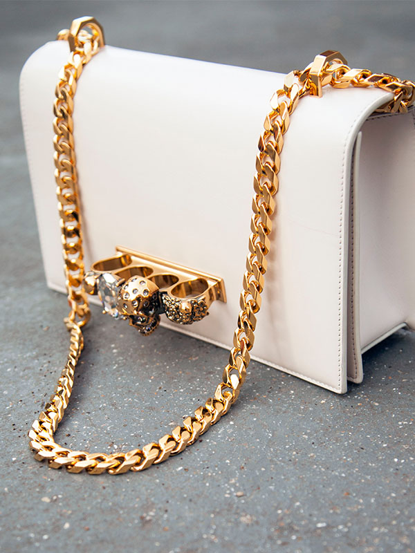 오른손에 착용한 18K 옐로 골드 티파니 T1 내로우 힌지드 뱅글과 18K 옐로 골드 티파니 T1 와이드 힌지드 뱅글, 18K 로즈 골드 티파니 T 트루 링, 왼손에 착용한 18K 옐로 골드에 라운드 브릴리언트 컷 다이아몬드를 풀 파베 세팅한 티파니 T1 와이드 다이아몬드 힌지드 뱅글, 검지에 착용한 18K 로즈 골드 티파니 T 트루 와이드 링, 소지에 착용한 18K 로즈 골드 티파니 T1 내로우 링은 모두 티파니(Tiffany & Co.), 슬리브리스 니트 톱은 메종 마르지엘라(Maison Margiela), 디스트로이드 팬츠는 르마드(Lemard), 부츠는 페라가모(Ferragamo).