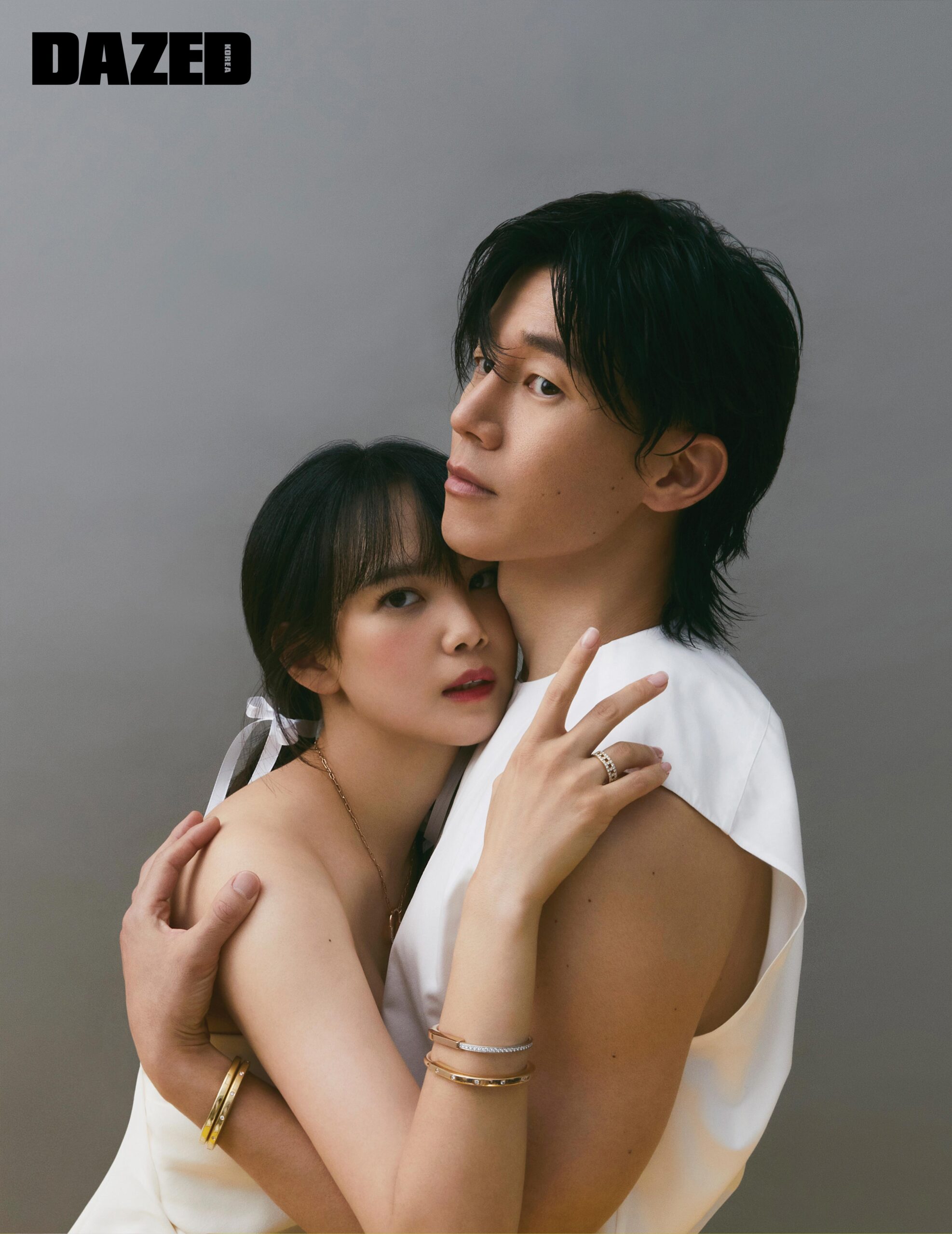 무열이 착용한 18K 화이트 골드에 라운드 브릴리언트 컷 다이아몬드를 하프 세팅한 티파니 T1 와이드 다이아몬드 힌지드 뱅글과 18K 화이트 골드에 다이아몬드를 파베 세팅한 티파니 T 투 내로우 링은 모두 티파니(Tiffany & Co.), 재킷은 톰 포드(Tom Ford), 블랙 티셔츠는 르메르(Lemaire). 승아가 착용한 18K 화이트 골드에 라운드 브릴리언트 컷 다이아몬드를 세팅한 티파니 노트 드롭 이어링과 18K 화이트 골드에 라운드 브릴리언트 컷 다이아몬드를 세팅한 티파니 노트 네크리스, 플래티넘에 하프 서클의 라운드 브릴리언트 컷 다이아몬드를 세팅한 티파니 포에버 밴드 링과 레이어링한 플래티넘에 라운드 브릴리언트 컷 다이아몬드를 파베 세팅한 티파니 세팅 인게이지먼트 링은 모두 티파니(Tiffany & Co.), 퍼프소매 드레스는 욜란크리스(Yolancris).