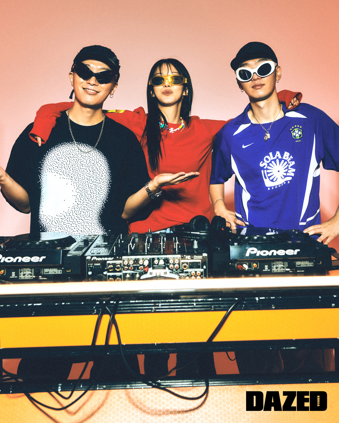 코난이 착용한 선글라스는 젠틀 몬스터(Gentle Monster), 티셔츠와 팬츠, 해트, 이어링, 네크리스, 워치는 모두 코난의 것. 효연이 입은 롱 슬리브 톱과 데님 스커트는 디젤(Diesel), 선글라스는 메종 마르지엘라 × 젠틀 몬스터(Maison Margiela × Gentle Monster), 네크리스는 에디터의 것. 코커가 착용한 선글라스는 메종 마르지엘라 × 젠틀 몬스터(Maison Margiela × Gentle Monster), 티셔츠와 팬츠, 해트, 이어링, 네크리스, 브레이슬릿은 모두 코커의 것.