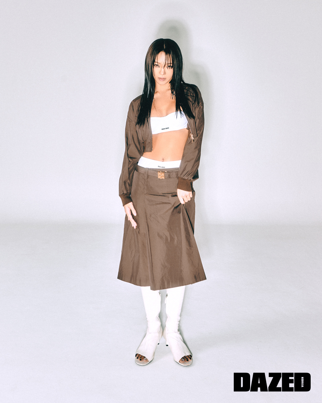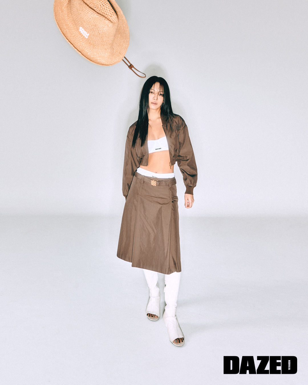 재킷과 미디스커트, 부츠, 페도라, 브라톱, 브리프, 벨트는 모두 미우미우(Miu Miu).