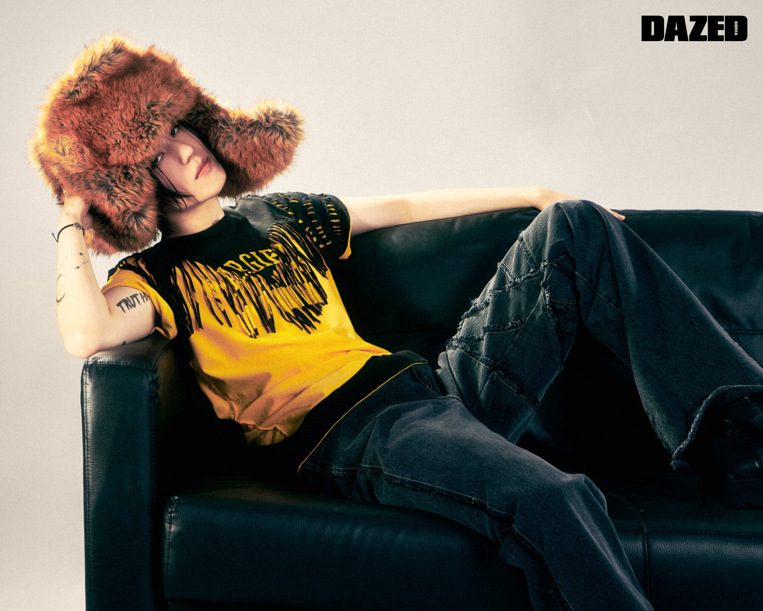 프린지 디테일 티셔츠는 메종 마르지엘라(Maison Margiela), 데님 팬츠는 앤더슨벨(Andersson Bell), 레이스업 부츠는 지방시(Givenchy), 퍼 해트는 버버리(Burberry).