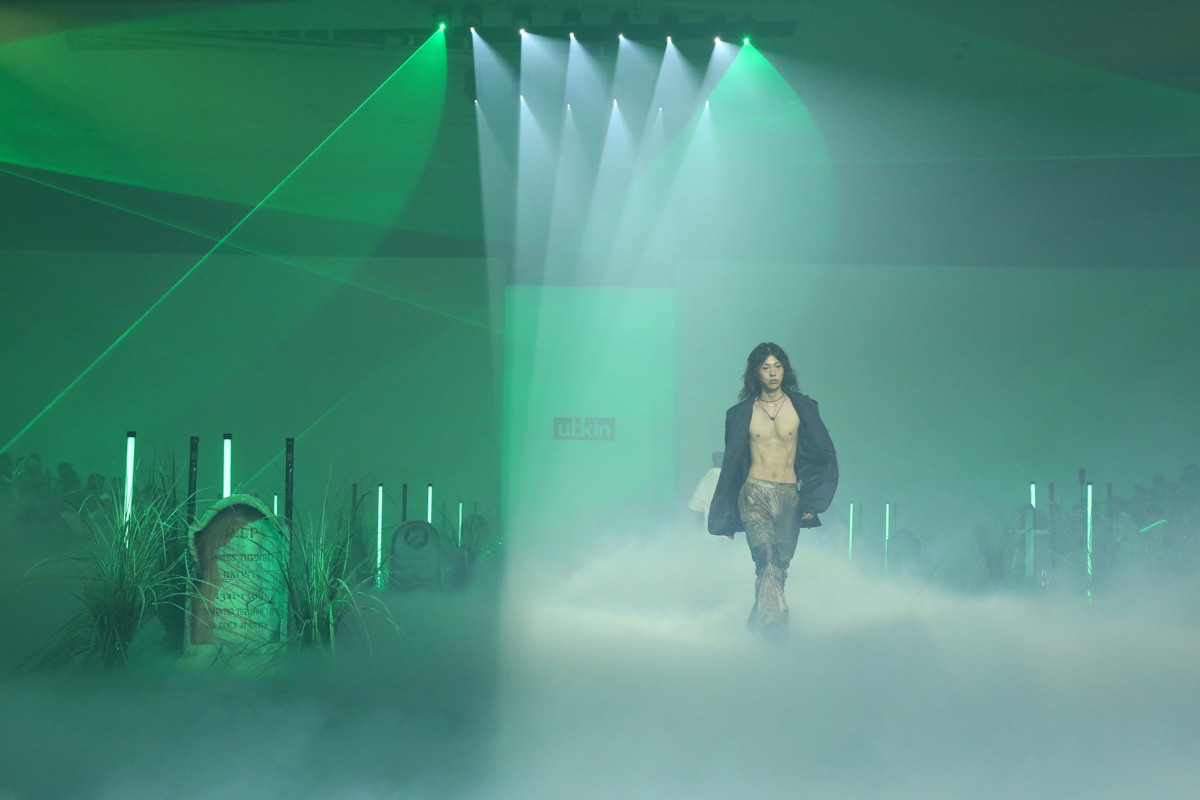 이번 시즌 얼킨은 공동묘지 캠핑클럽(Cemetery Camping Club) 컨셉 아래 밀리터리 무드 컬렉션을 구성했다. 런웨이 무대 위 설치된 비석들과 자욱한 안개가 스민 쇼장은 공동묘지를 연상시켜 스산한 분위기를 자아낸다. 이성동 디자이너의 군대 일화에서 시작해 캠핑과 아웃도어 액티비티 룩에서 영감을 얻은 컬렉션은 웨어러블하면서도 리사이클 소재의 비중을 높여 지속 가능한 패션을 다양한 디자인으로 선보였다.