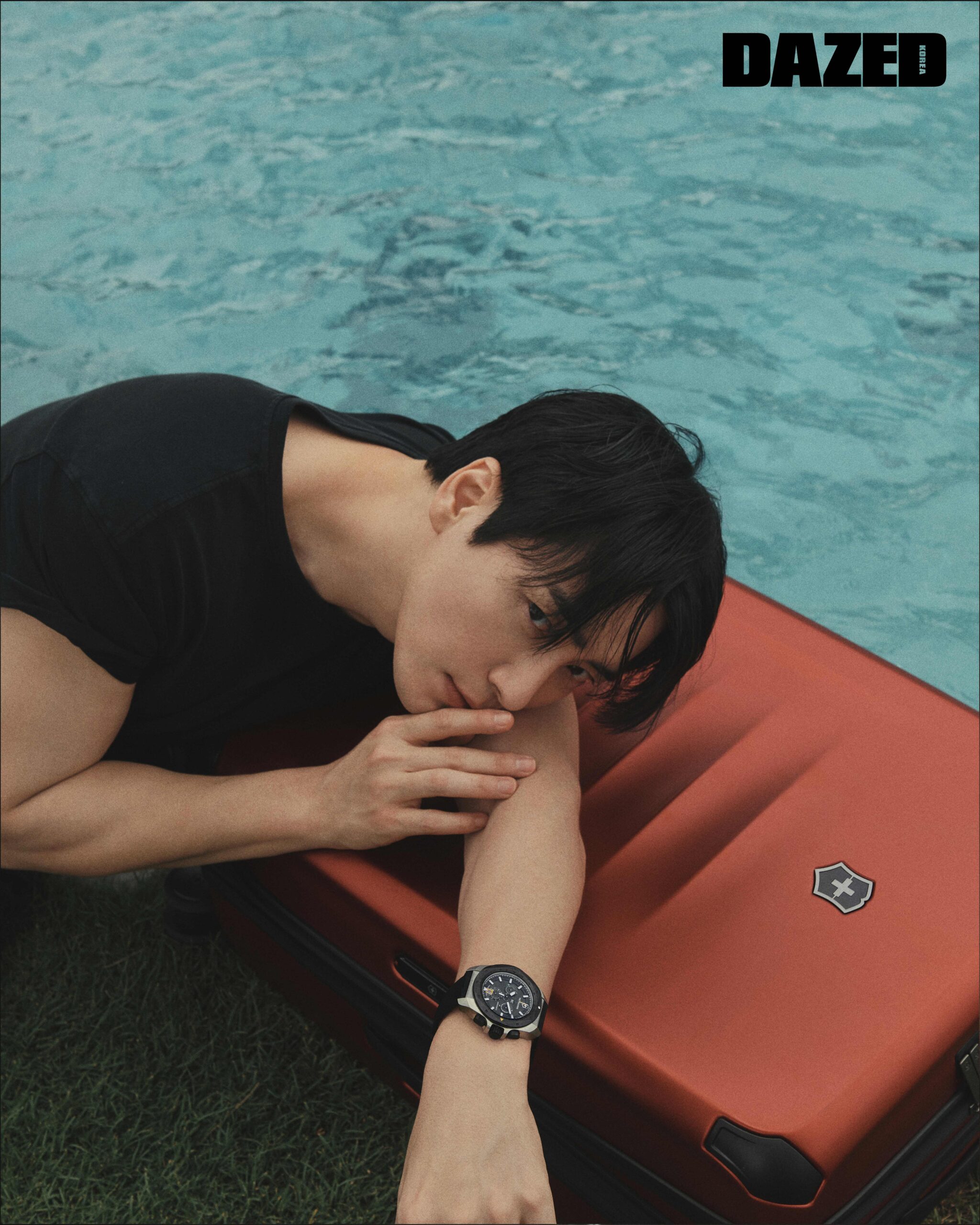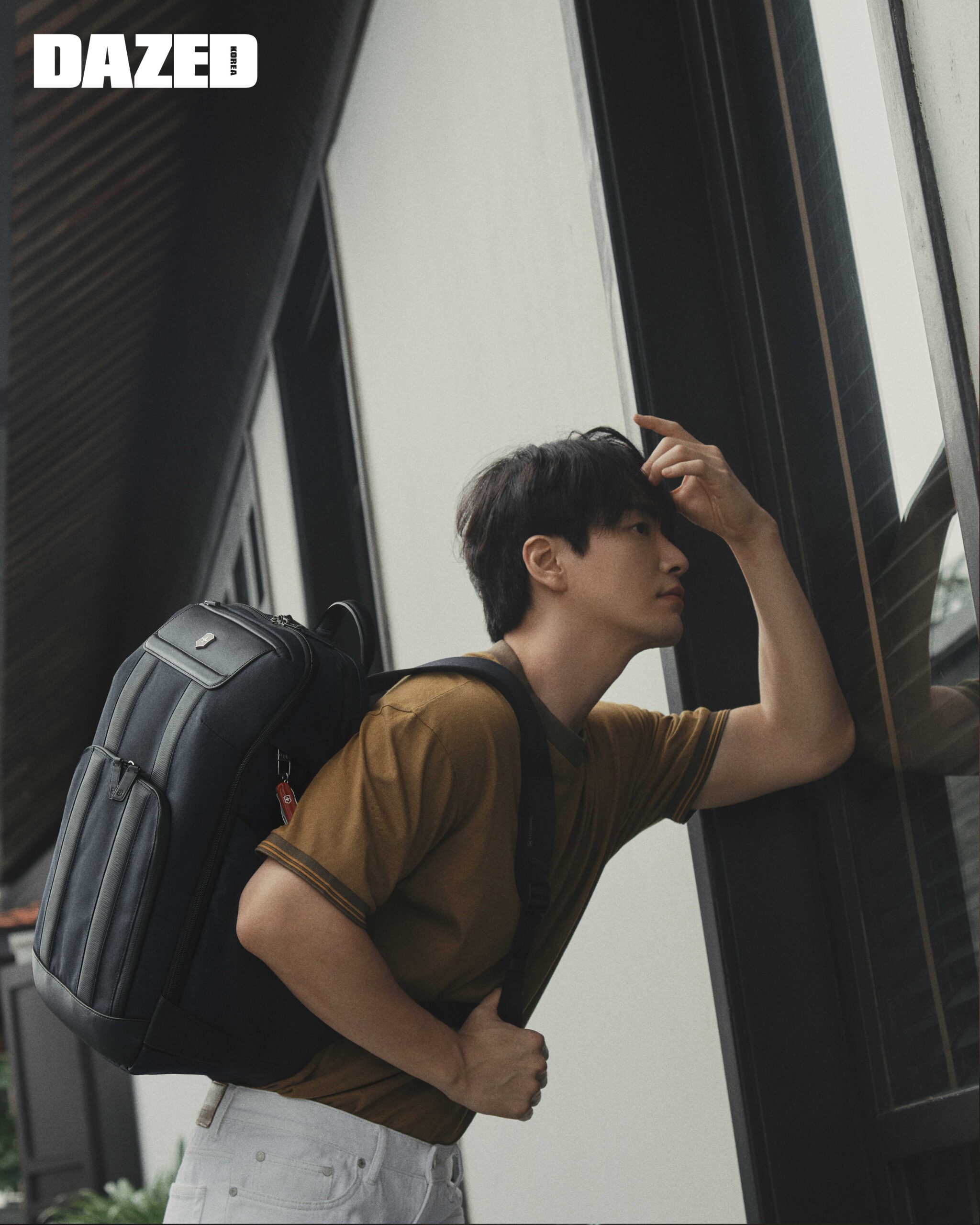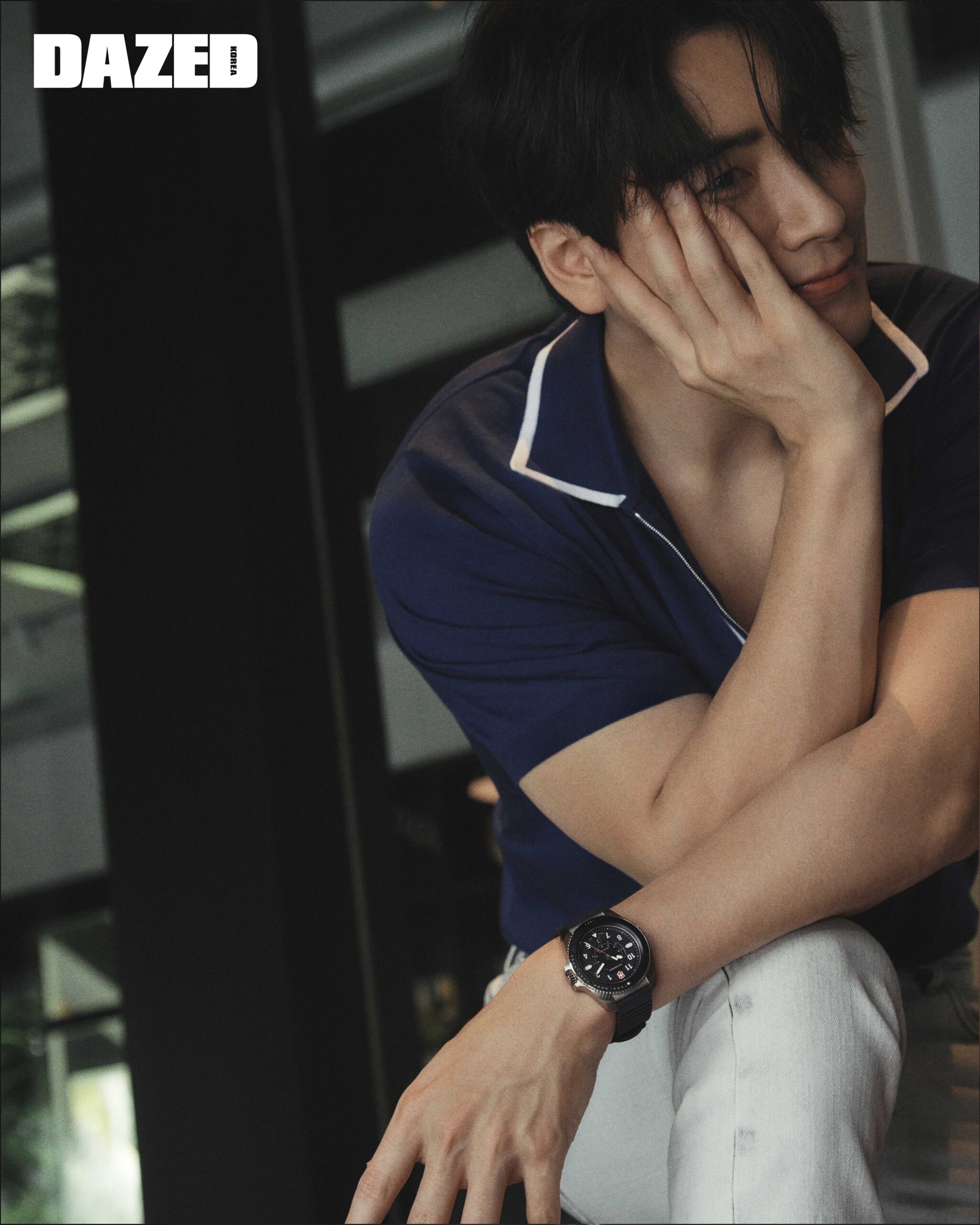 쿼츠 무브먼트와 충격 저항 및 방수 기능을 탑재해 아웃도어 감성과 엔지니어링 DNA을 완벽히 결합시킨 져니 1884JOURNEY 1884 워치는 빅토리녹스(Victorinox), 카라 니트 톱과 워싱 데님 팬츠는 키톤(Kiton).