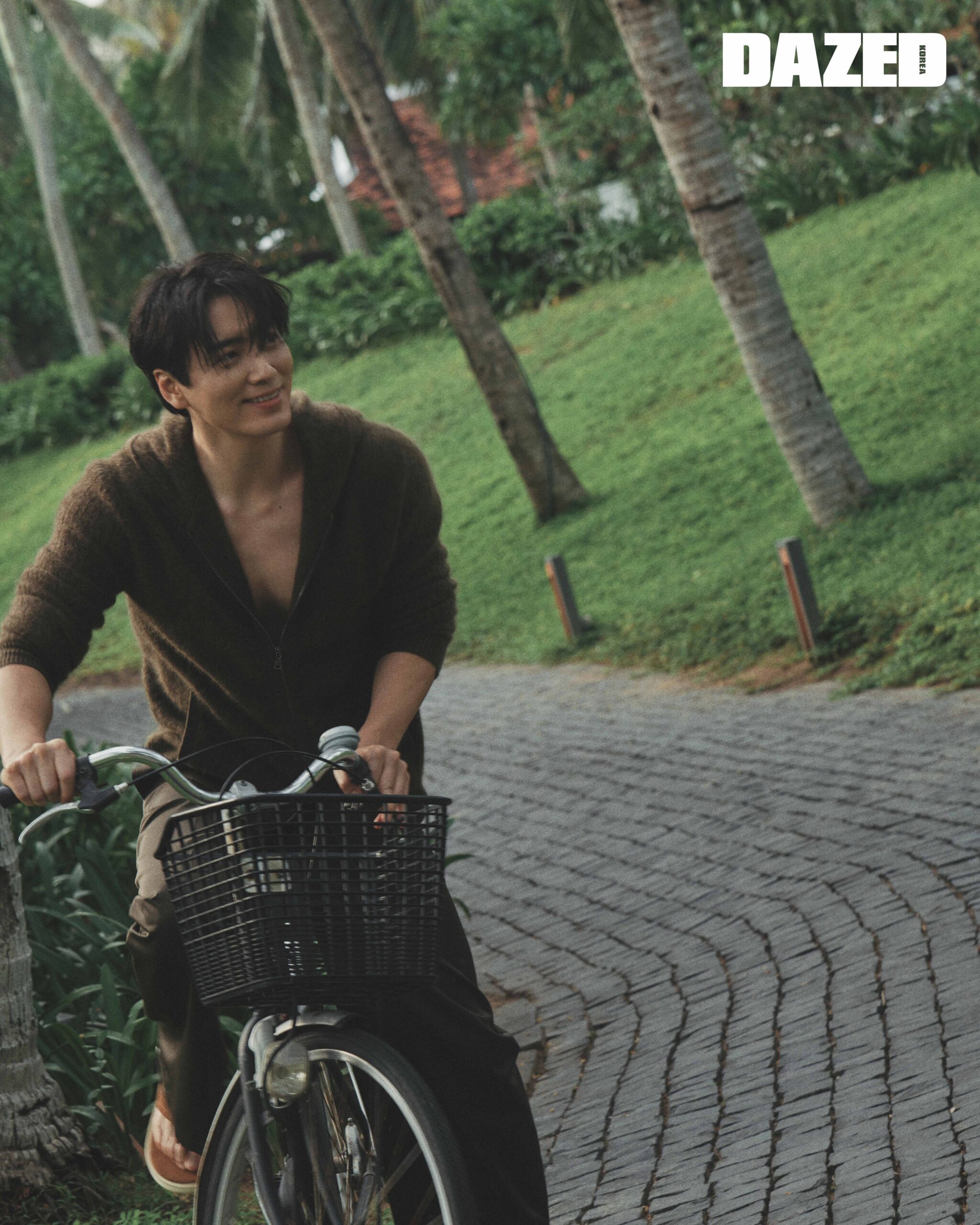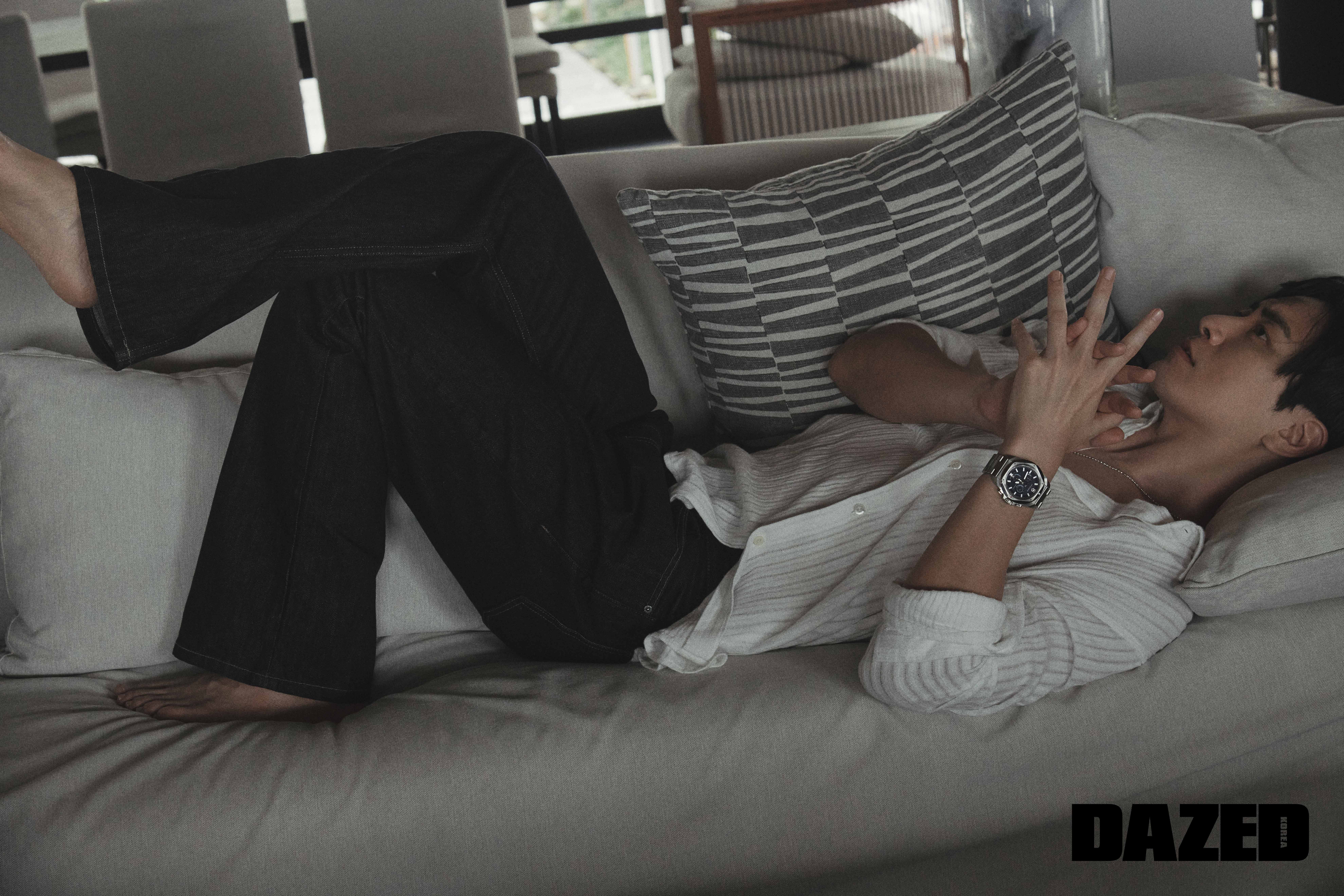 니트 집업은 바바토스(John Varvatos), 팬츠는 무명(moomyung), 스웨이드 샌들은 크리스틴(Kristin).