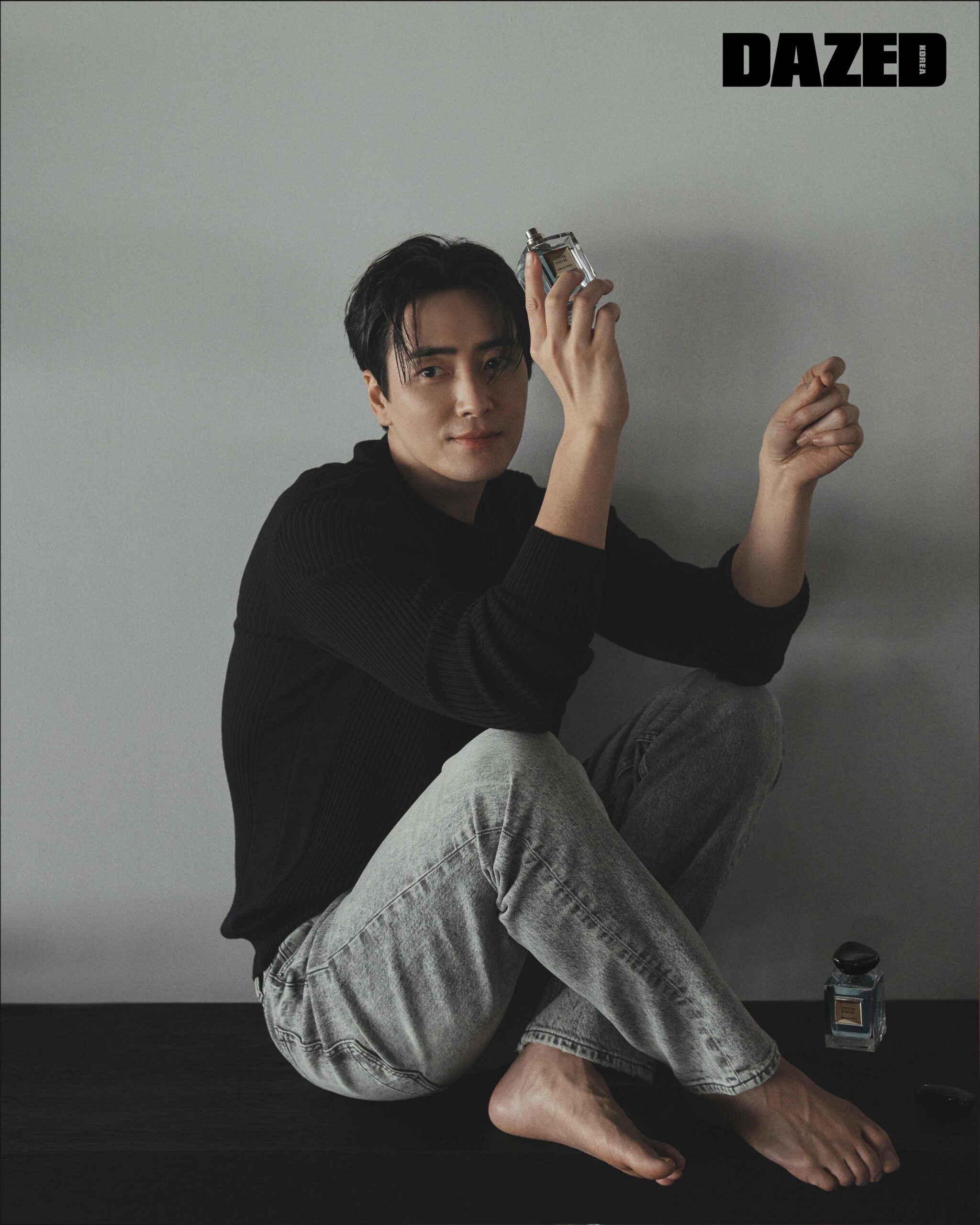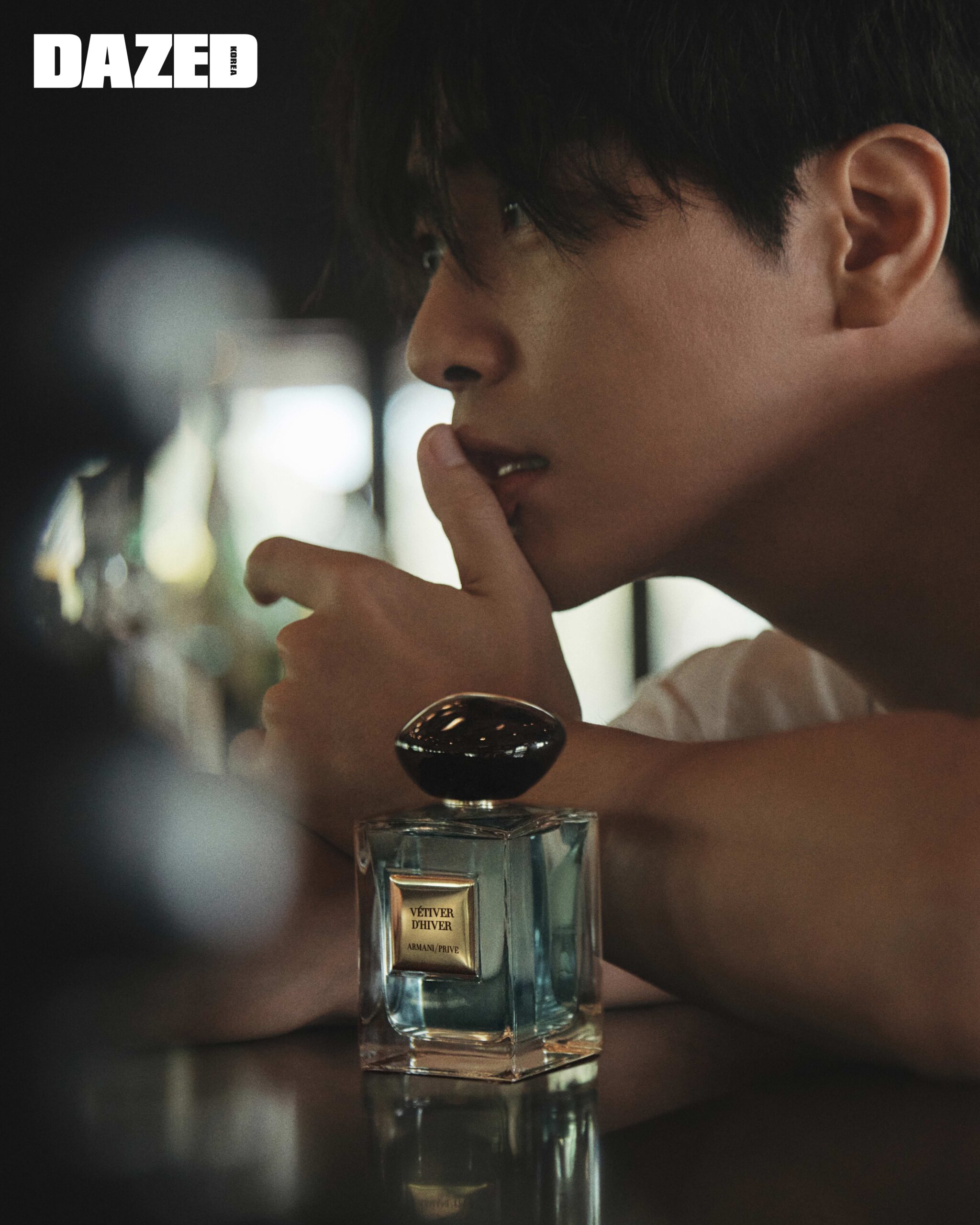 시트러스 계열로 상쾌하게 향이 시작되며, 차갑지만 따스한 매력을 지닌 깊은 풀향의 베티버와 파출리로 우아하게 마무리되는 향기 아르마니 뷰티 프리베 베티베 디베, 니트 톱은 조르지오 아르마니(Giorgio Armani), 데님 팬츠는 올세인츠(All Saints).