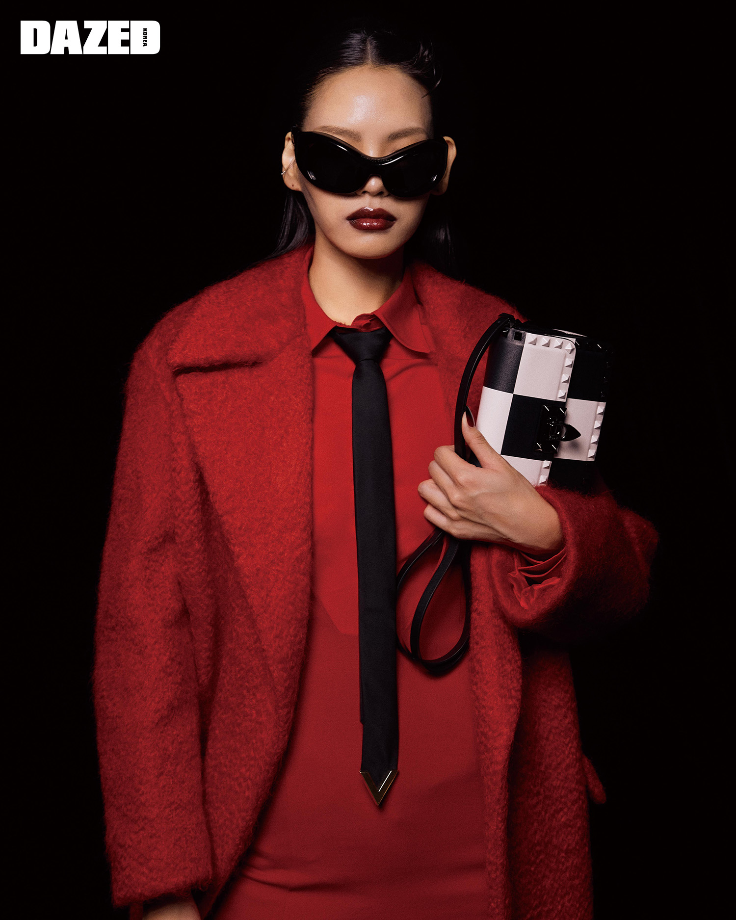 오버사이즈 코트와 셔츠, 드레스는 모두 발렌티노(Valentino), 메탈 V 아플리케 울·실크 발렌타이 타이와 체크 프린트 스몰 락스터드 숄더백은 발렌티노 가라바니(Valentino Garavani), 에이비에이터 선글라스는 메종 마르지엘라 × 젠틀몬스터(Maison Margiela × Gentle Monster), 네일 팁은 핑거수트(Finger Suit).