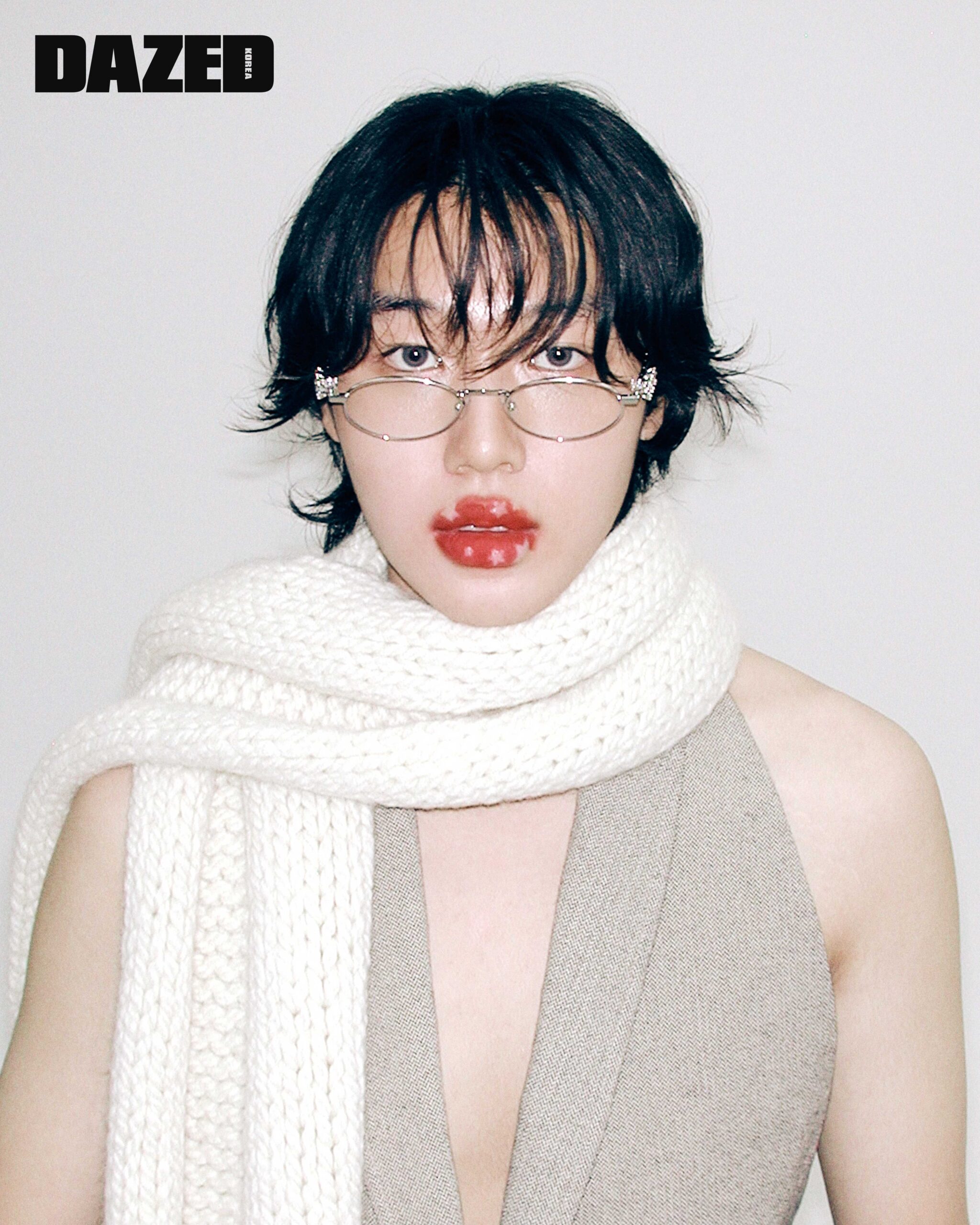 베스트와 머플러는 루이 비통(Louis Vuitton), 안경은 젠틀몬스터(Gentle Monster).