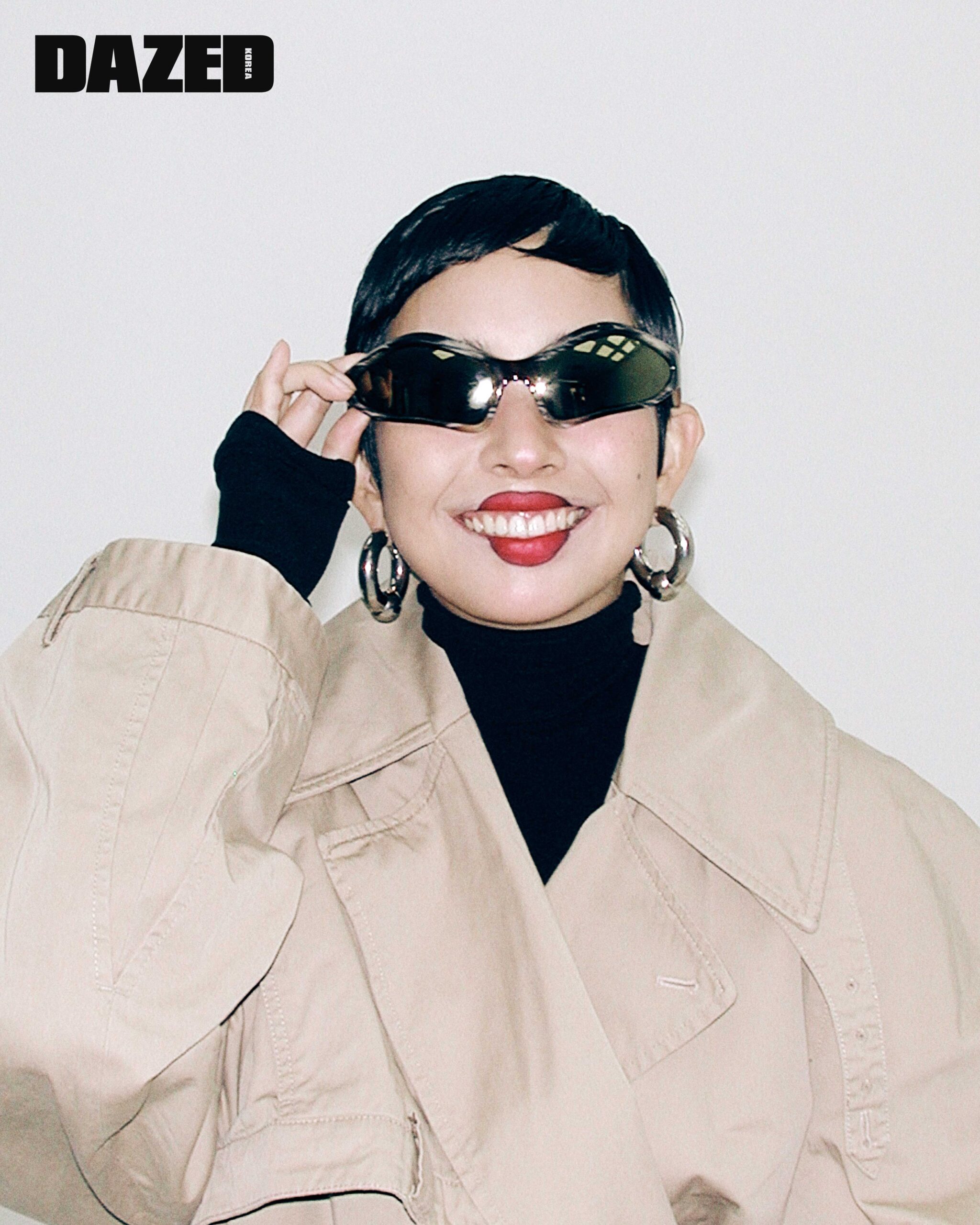 트렌치코트와 터틀넥 톱, 실버 볼 이어링, 선글라스는 모두 발렌시아가(Balenciaga).