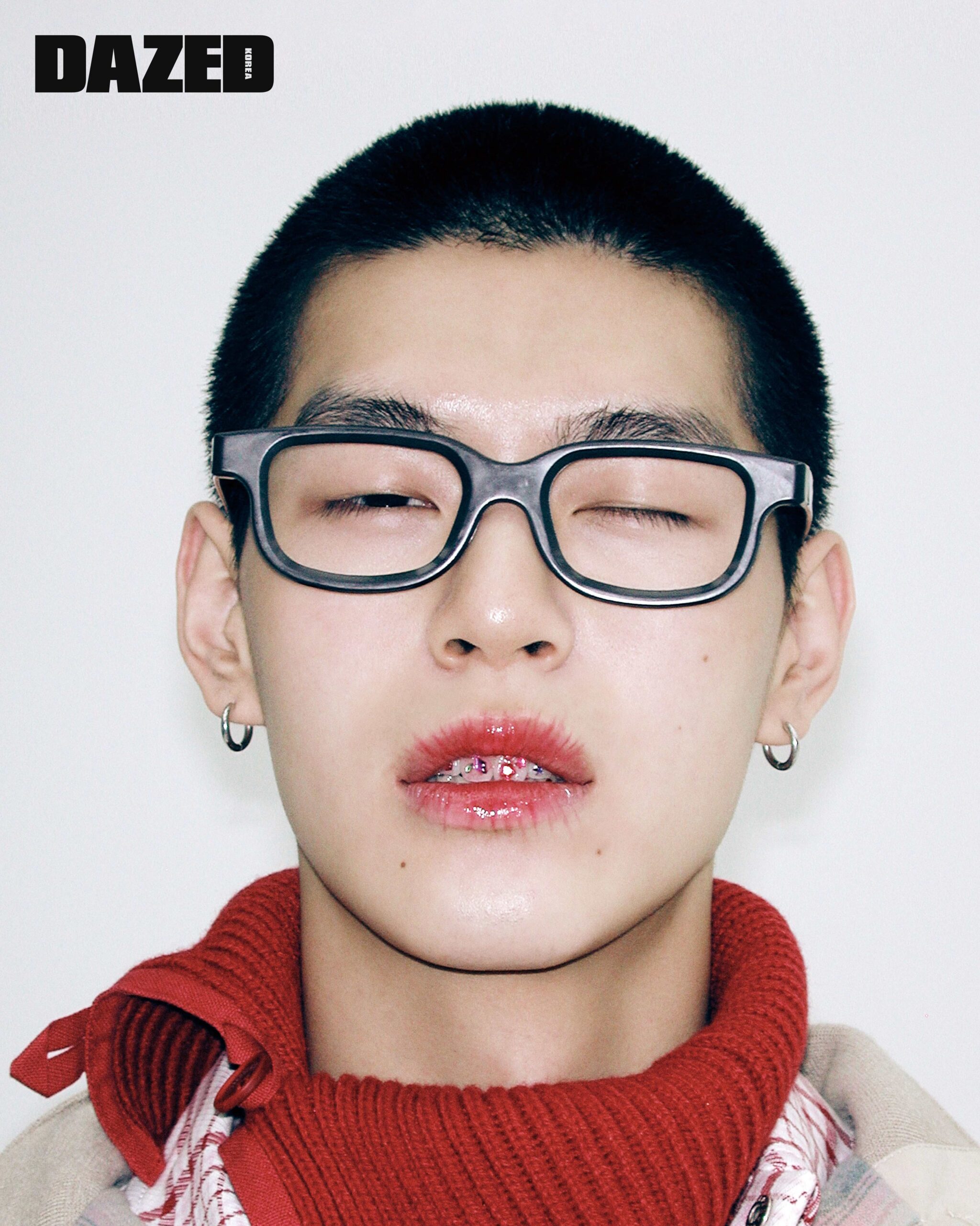 레드 니트 톱과 체크 아우터는 자크뮈스(Jaquemus), 아우터는 마르지엘라(Margiela), 안경은 스타일리스트의 것, 이어 링은 지호의 것.