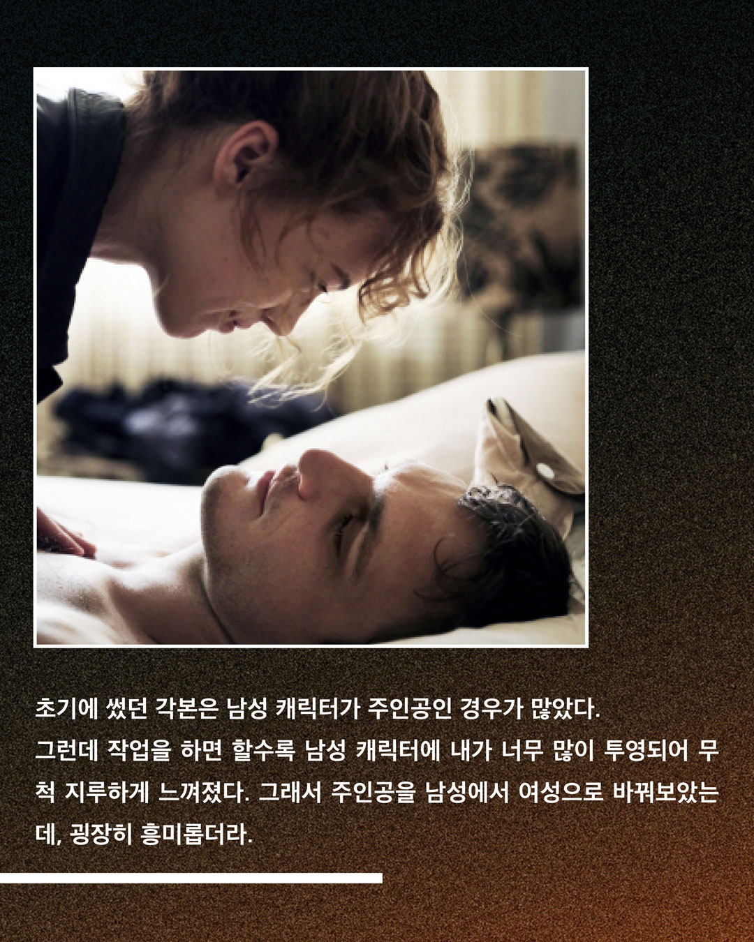 가장 초기에 썼던 각본은 남성 캐릭터가 주인공인 경우가 많았다. 그런데 계속 작업을 하면 할수록 이 남성 캐릭터에 내가 너무 많이 반영이 되어, 무척 지루하게 느껴졌다. 그래서 주인공을 남성에서 여성으로 바꿔보았는데, 굉장히 흥미롭더라. 내 영화 속 남성은 여성을 바라보기는 하지만 여성을 정복하진 못한다. 여성은 늘 주체가 되고 남성은 이를 허락하지 않으려고 하는, 흥미로운 관계가 생긴다. <어파이어> 역시 한 여성을 바라보는 남성의 자화상에 관한 영화라고도 할 수 있다.