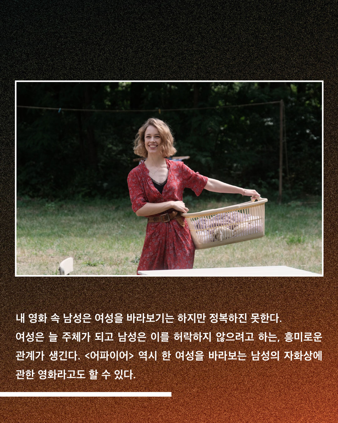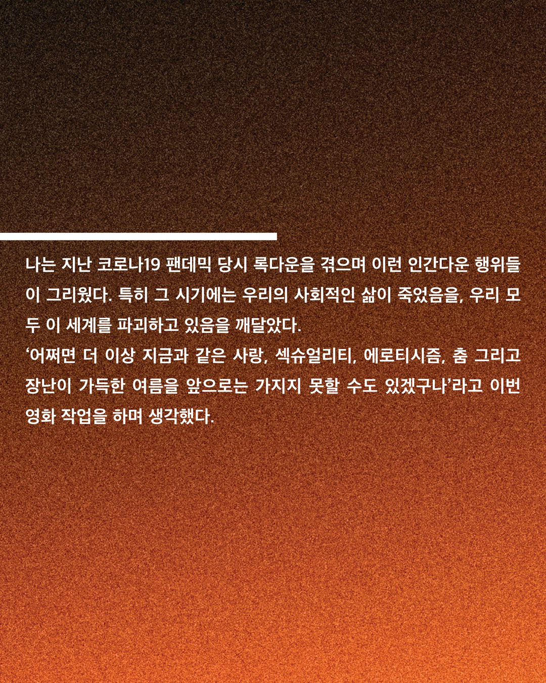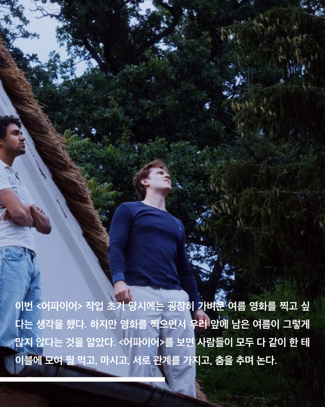 이번 <어파이어> 작업 초기 당시에는 굉장히 가벼운 여름 영화를 찍고 싶다는 생각을 했다. 하지만 영화를 찍으면서 우리 앞에 남은 여름이 그렇게 많지 않음을 알았다. <어파이어>를 보면 사람들이 모두 다 같이 한 테이블에 모여 뭘 먹고, 마시고, 서로 관계를 가지고, 춤을 추며 논다. 나는 지난 코로나 19 펜데믹 당시 록다운을 겪으며 이런 인간다운 행위들이 그리웠다. 특히 그 시기에는 우리의 사회적인 삶이 죽었음을 알고, 우리 모두 이 세계를 파괴하고 있다는 자각이 들었다. 어쩌면 더 이상 지금과 같은 사랑, 섹슈얼리티, 에로티시즘 그리고 춤 그리고 장난이 가득한 여름을 우리가 앞으로는 가지지 못할 수도 있겠구나라는 생각을 이번 영화 작업을 하며 느꼈던 것 같다.