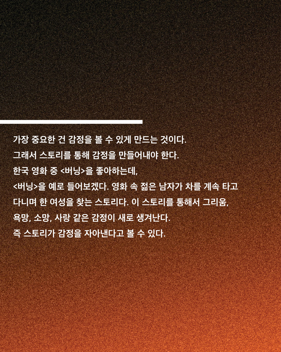 가장 중요한 건 감정을 볼 수 있게 만드는 것이다. 그래서 스토리를 통해 감정을 만들어 내야 한다. 한국 영화 중 <버닝>을 좋아하는데, <버닝>을 예로 들어보겠다. 영화 속 젊은 남자가 차를 계속 타고 다니며 한 여성을 찾는 건 스토리다. 하지만 이 스토리를 통해서 그리움, 욕망, 소망, 사랑과 같은 감정이 새로 생겨난다. 즉 스토리가 감정을 자아내는 것이라고 볼 수 있다. 그런데 만약 이 남자 주인공이 그저 차에 앉아 “나는 그 여자를 욕망한다. 나는 여자를 그리워한다”라고 말하면 이건 아무것도 아니게 된다.(웃음) 내가 생각하는 영화는 사람으로 하여금 볼 수 있게 만드는 것이지, 무언가를 주장하는 것은 결코 아니다.