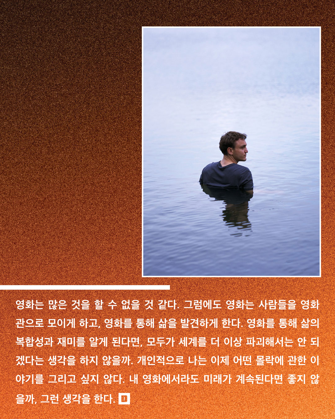 영화는 많은 것을 할 수 없을 것 같다. 그럼에도 불구하고 영화는 사람들로 영화관으로 모이게 하고, 영화를 통해 삶을 발견할 수 있게 한다. 영화를 통해 삶의 복합성과 재미를 알게 된다면, 모두가 세계를 그만 파괴해야겠다는 생각을 하지 않을까? 개인적으로 나는 이제 어떤 몰락에 관한 이야기를 그리고 싶지 않다. 나의 영화에서라도 미래가 계속된다면 좋지 않을까, 그런 생각을 한다.