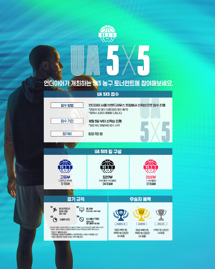 지난해에 이어 언더아머 5:5 농구 토너먼트 ‘UA 5X5’가 개최된다. UA 5X5 대회는 언더아머가 작년부터 아마추어 선수들을 대상으로 개최해 온 농구 토너먼트 경기로, 고등부, 남자 일반부, 여자 일반부로 나눠서 치러진다. 10월 28일, 결선에는 고등부 4개 팀과 남자 일반부 4개 팀, 여자 일반부 4개 팀이 우승 트로피와 총 5,000만원 규모의 상금과 혜택을 놓고 대결을 펼칠 예정이다.