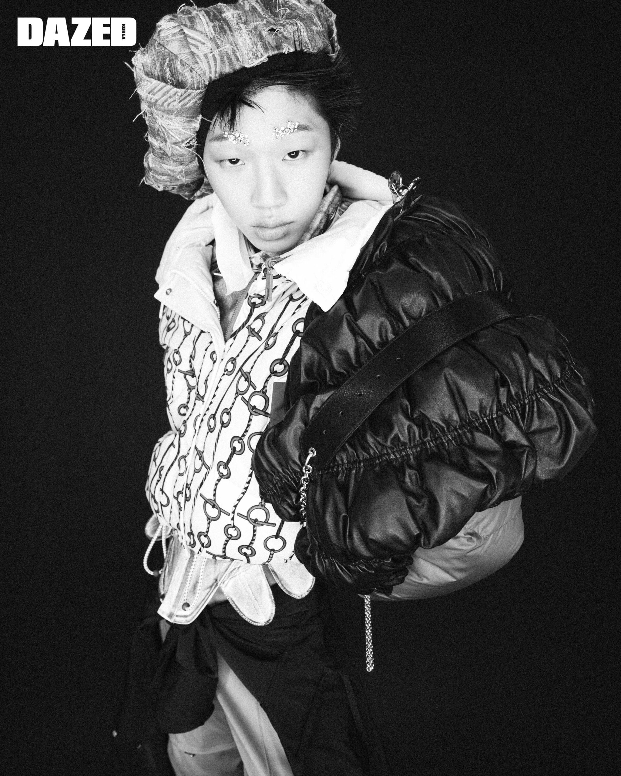 프린트 포인트 패딩 재킷과 유틸리티 팬츠, 셔츠는 모두 에르메스(Hermès), 하프 슬리브 셔츠와 베레는 준태킴(Juntae Kim), 숄더 패드로 연출한 패딩 재킷은 끌로에(Chloé), 레이어링한 벨트는 블루마린(Blumarine).