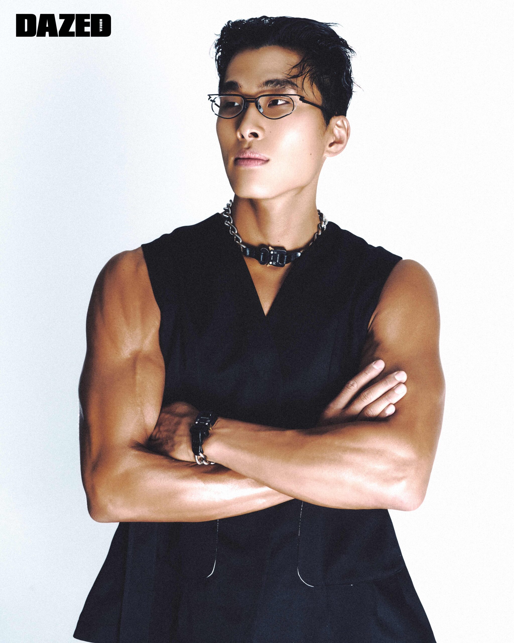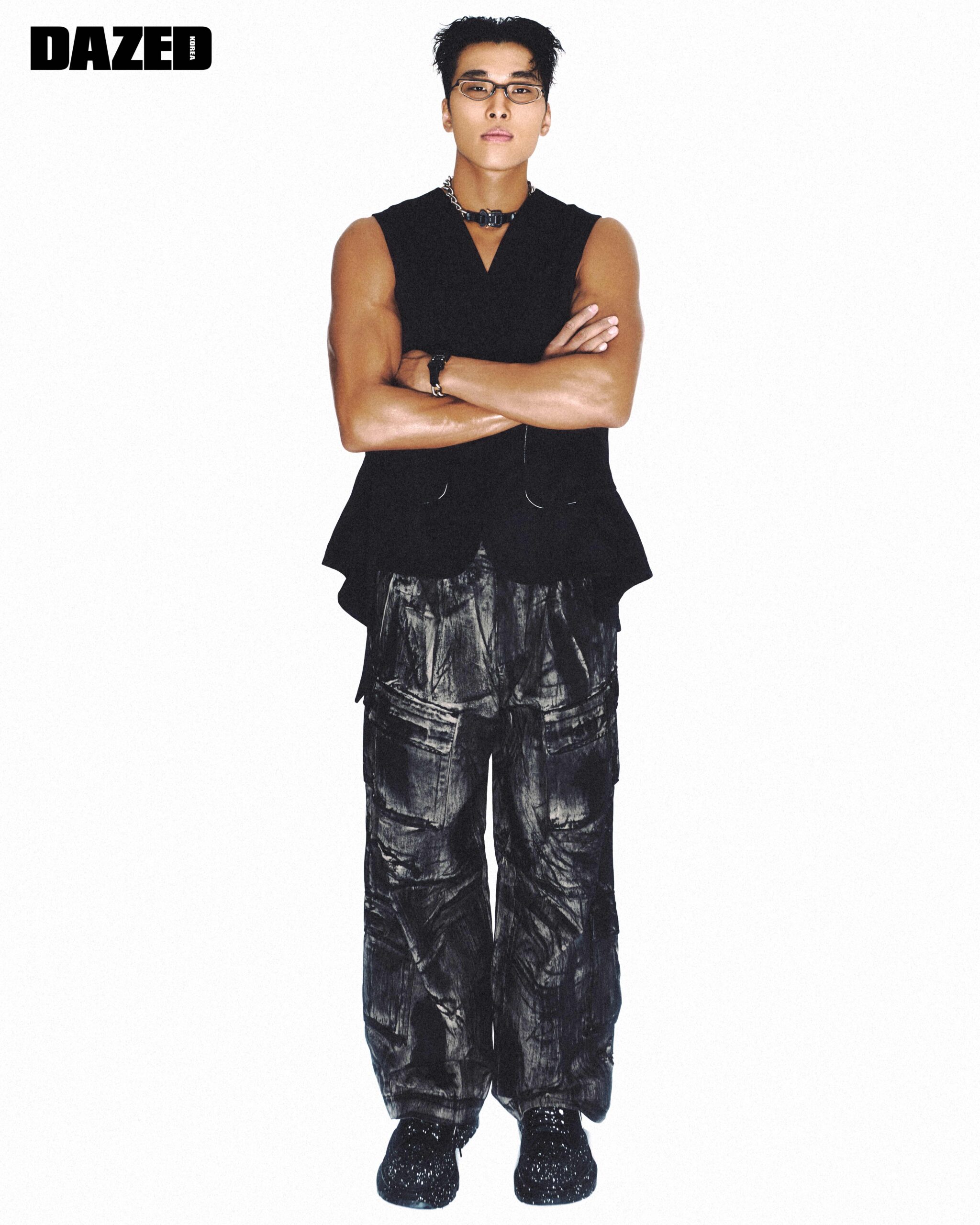 슬리브리스 베스트는 요헤이 오노(Yohei Ohno), 안경은 젠틀 몬스터(Gentle Monster), 네크리스와 브레이슬릿은 스타일리스트의 .