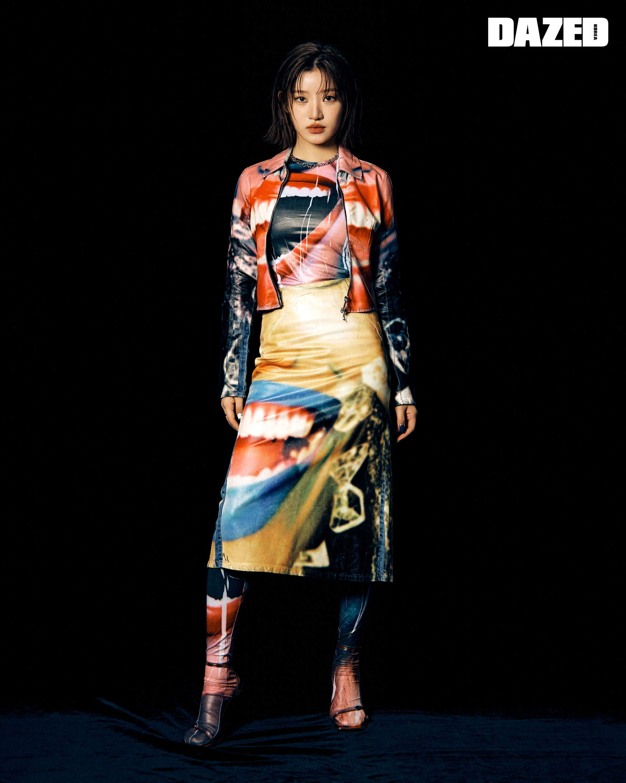 프린트 데님 재킷과 톱, 스커트, 레깅스, 스트랩 샌들 힐은 모두 디젤(Diesel), 네크리스는 허깅고트(Huggingoat).