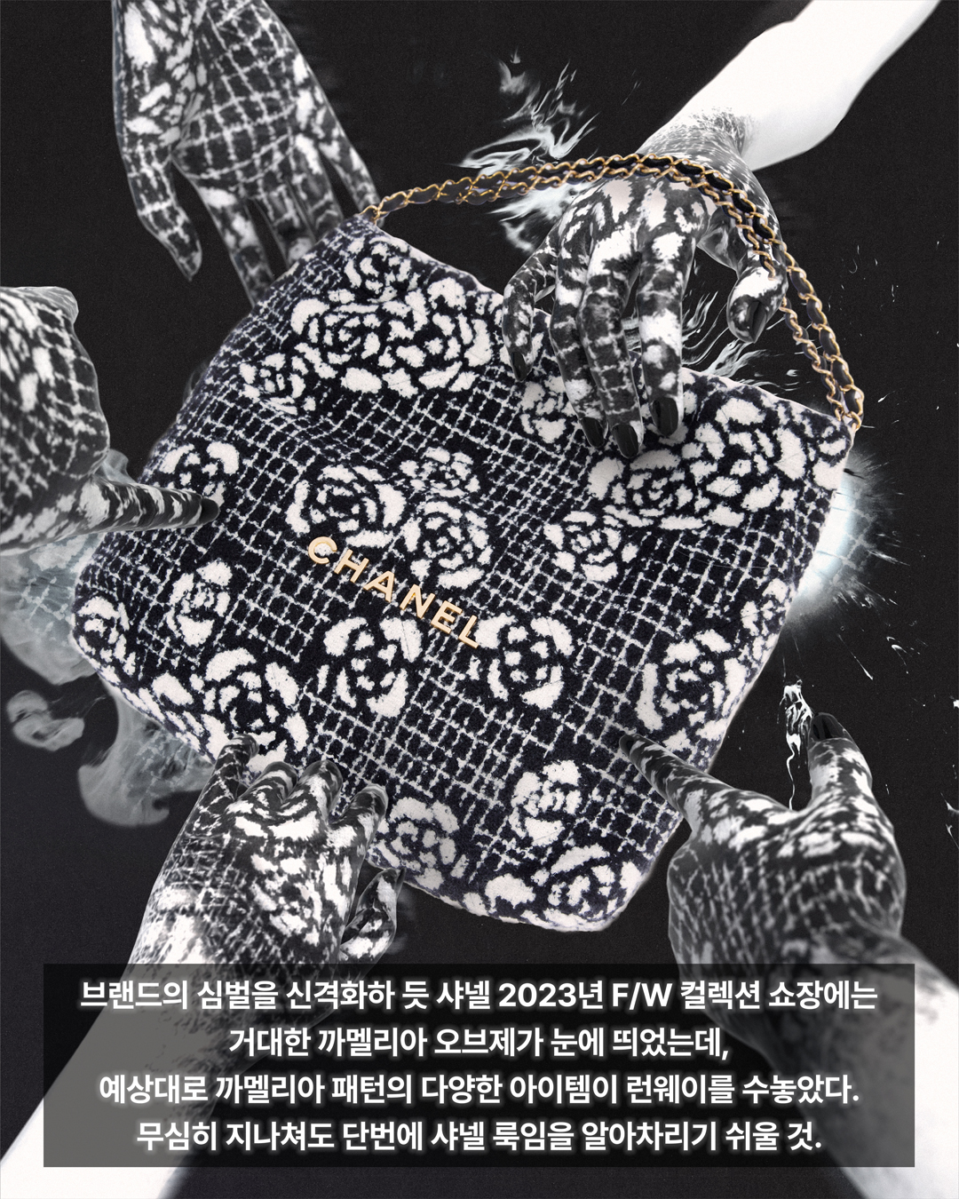 캐시미어 자카르 소재의 샤넬 22 핸드백은 샤넬(Chanel).